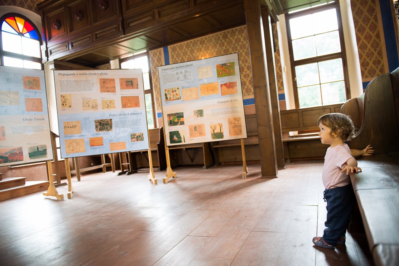 do odsvěceného kostela Zvěstování Panny Marie v Litoměřicích jsme přišli na výstavu Plynoucí prostor; koukej Verunko, támhle někde je hrad Helfenburk - tam se tatínek zamlada něco nablbnul; Kalvárie u Ostrého byla kompletně opravena lokálními nadšenci, klobouk dolů!; do biografu v Úštěku už si bohužel Verunka od loňska na žádný film o krtečkovi nezajde; v úštěcké synagoze byla aktuálně výstava obrázků namalovaných dětmi v terezínském ghettu; pod synagogou se ukrývá pokoj židovského učitele a židovská škola...; ...ve které by na sebe Verunka nejraději vylila obsah kalamáře; Verunka zkoumá designové lavice v Litoměřických Jiráskových sadech; počasí v teplickém zámeckém parku k vyjížďce bohužel zrovna moc nevybízelo
