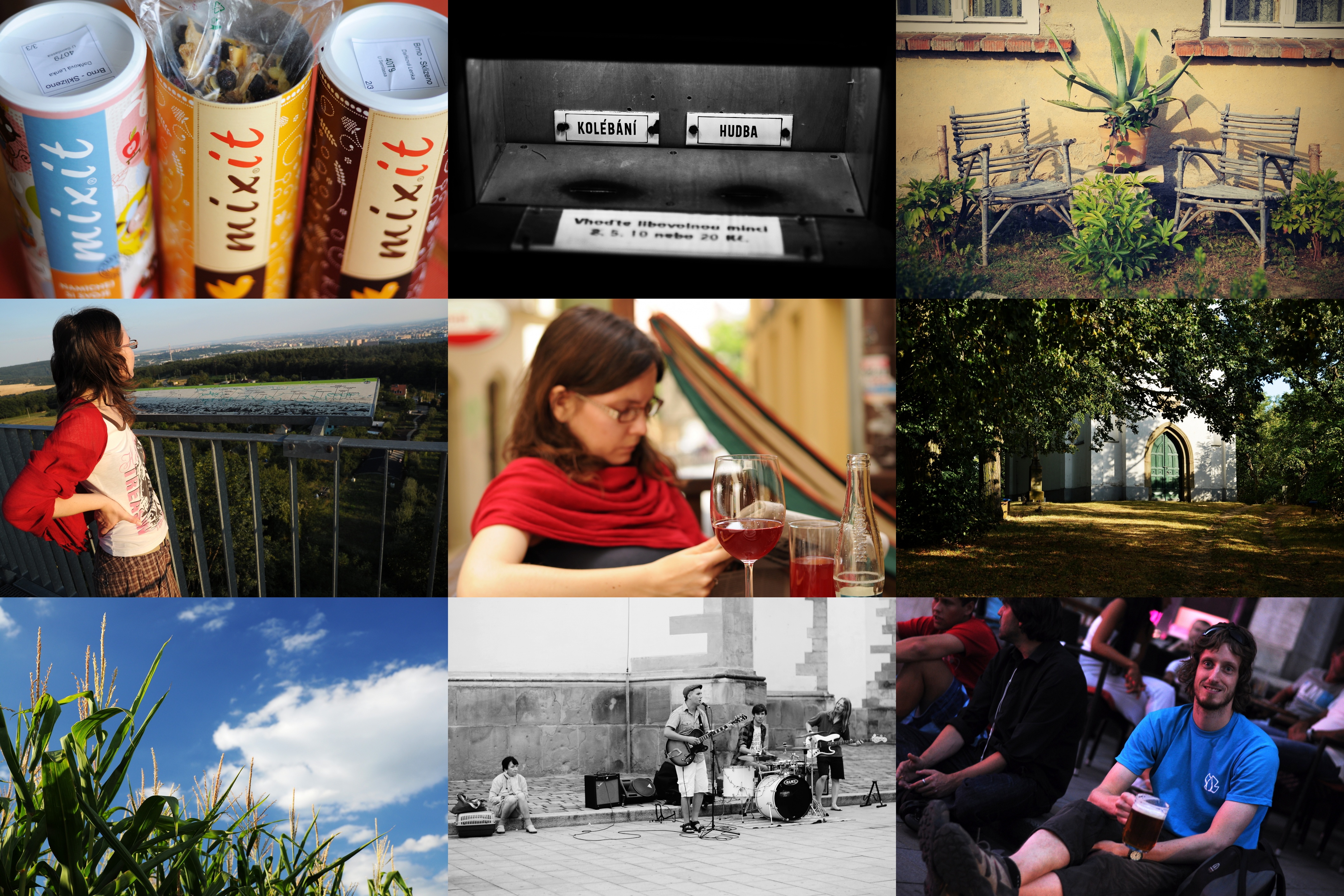 Namíchali jsme si svoje müsli / Zásadní dilema - naštěstí s sebou máme dvě mince / Zátiší s kaktusem ve Vranově / V Soběšicích nás příjemně překvapila Ostrá horka / Nedělní pohoda se sklenkou moštu / Kaple sv. Jakuba v Ivančicích / Kukurukukuřice / V Brně mají i pouliční kapely své groupie :) / Posezení u piva před barem Na stojáka