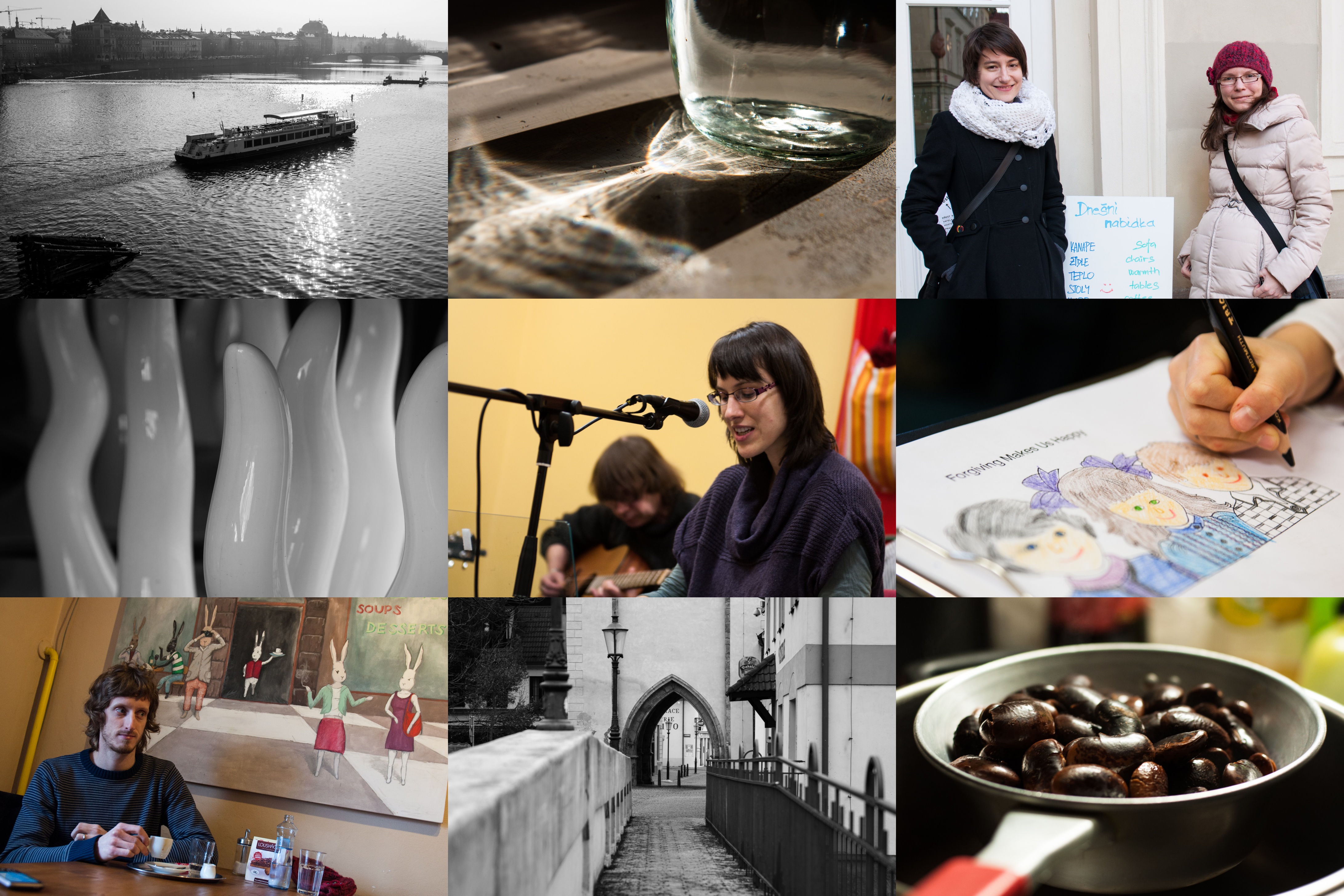 Takhle v sobotu po ránu na Karlově mostě... / Ze série 'umění od kavárenského stolu' / Z dnešní nabídky jsme využili hlavně stolek, židle, a taky teplo / Záhadné objekty na školním dvoře / Pavča chválí a my s ní / Forgiving makes us happy / Strakatý králík v Berouně / Berounské zátiší / Co bude asi zítra k obědu? :)
