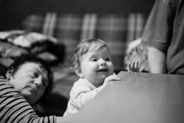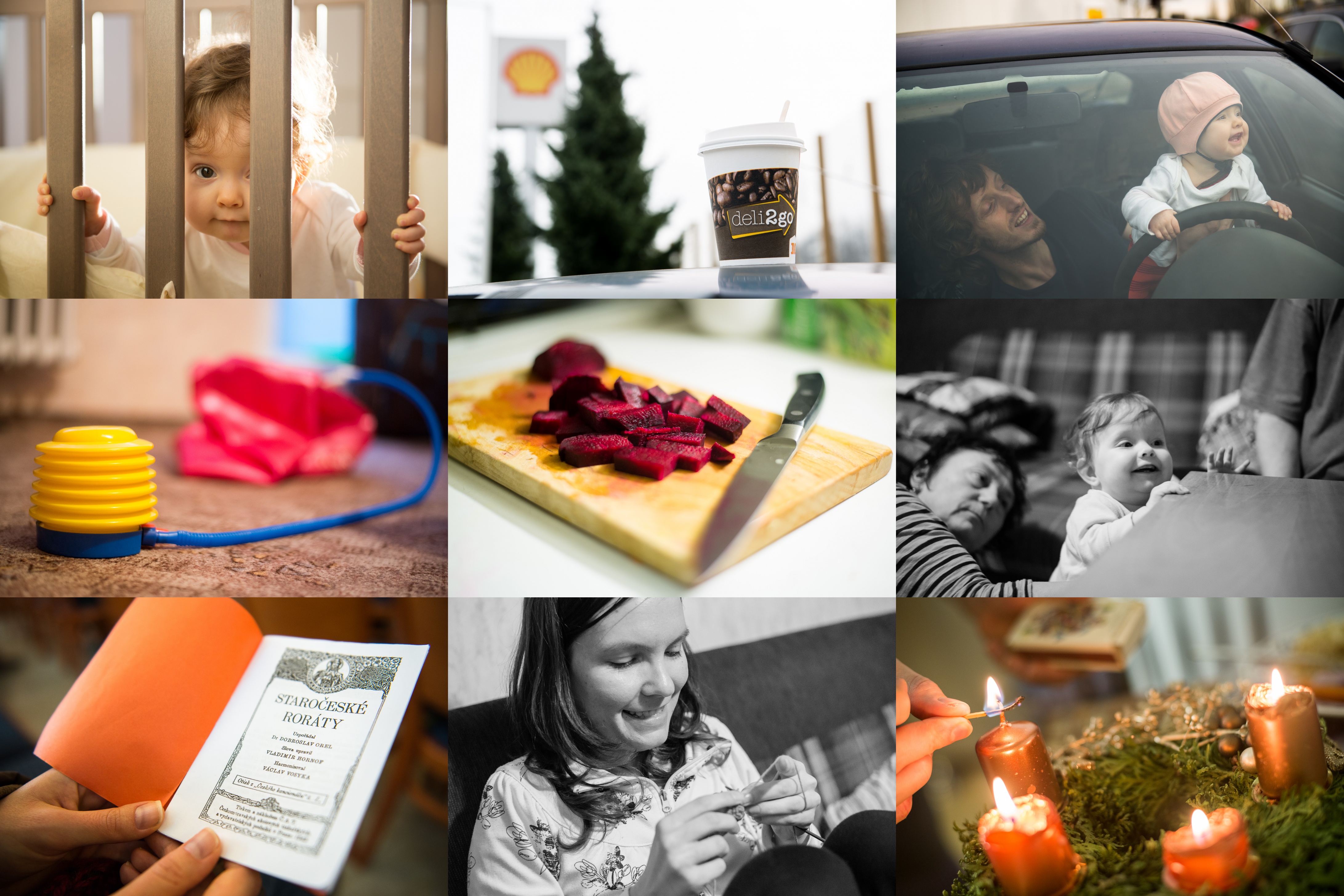 Verunka, koupajíc se v v ranním slunci, dohlíží, abychom nezapomněli zabalit žádnou z jejích oblíbených plenek / Kafe na km 60, my do té Prahy snad nakonec dojedem! (i přes rozsvícenou varovnou kontrolku) / Tatínek dohlíží na správné držení volantu, Verunka by ho ale stejně nejradši ohryzala / Nezbytná uspávací pomůcka, problém může nastat, pokud doma zapomenete špunt / Verunčina oblíbená ingredience, čím víc Bio, tím červenější / Dobytí konferenčního stolku / Zpíváme podle faksimile originálu z roku 1943 / Hladce a obrace, to je ale legrace! / Čtvrtá adventní neděle, už jsme museli nastavovat
