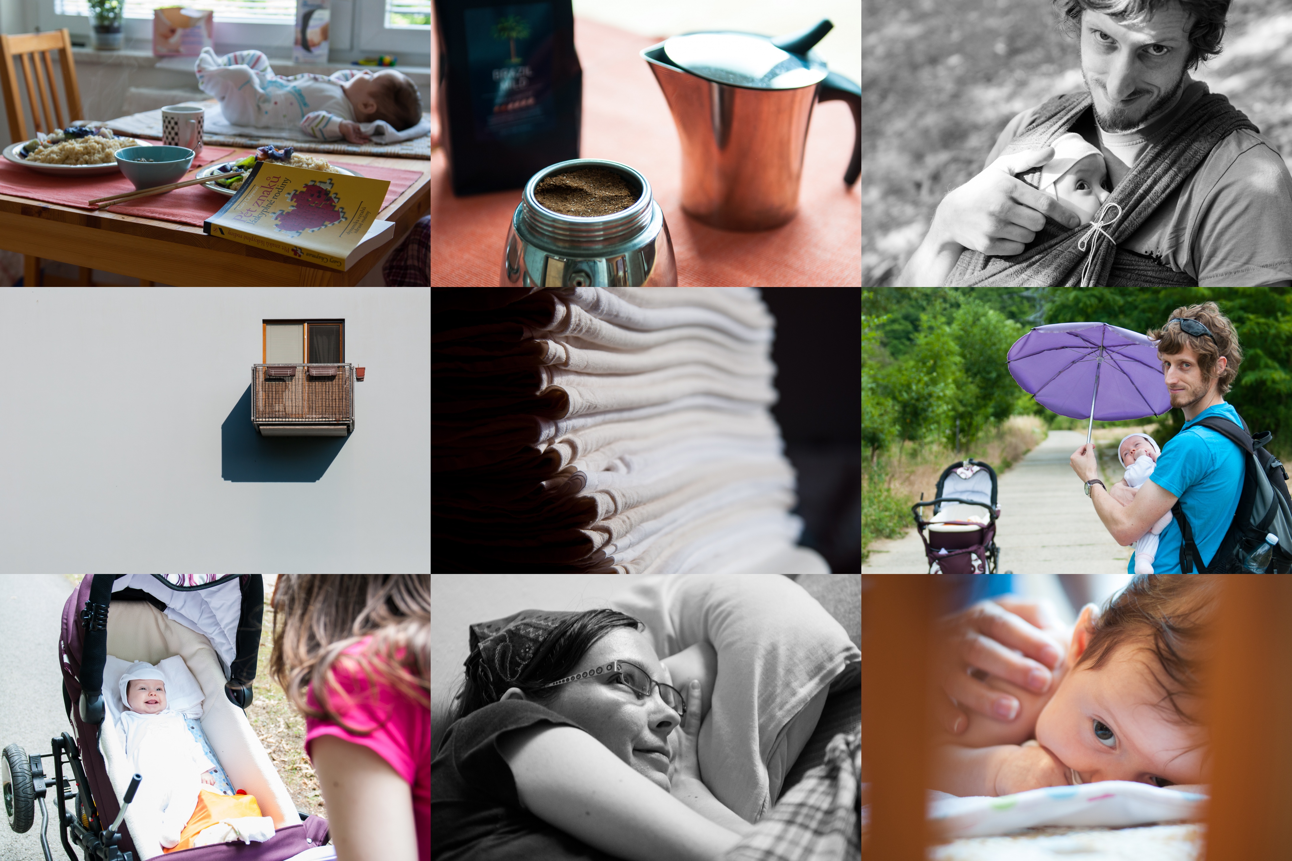 Zatímco do sebe budou rodiče ládovat snídani, Verunka trochu / Takové to domácí kafíčko / Kouzlo nošení / Krásy sídliště / Po ranním žehlení / Naše typická procházka s kočárkem / ... Ale odměnou za vytrvalost nám byl dokonce kočárkový vý / Lenča zaujatě sleduje hudební pořad s naším oblíbeným ne / Komu by se nelíbilo zakončit víkend pořádnou masáží