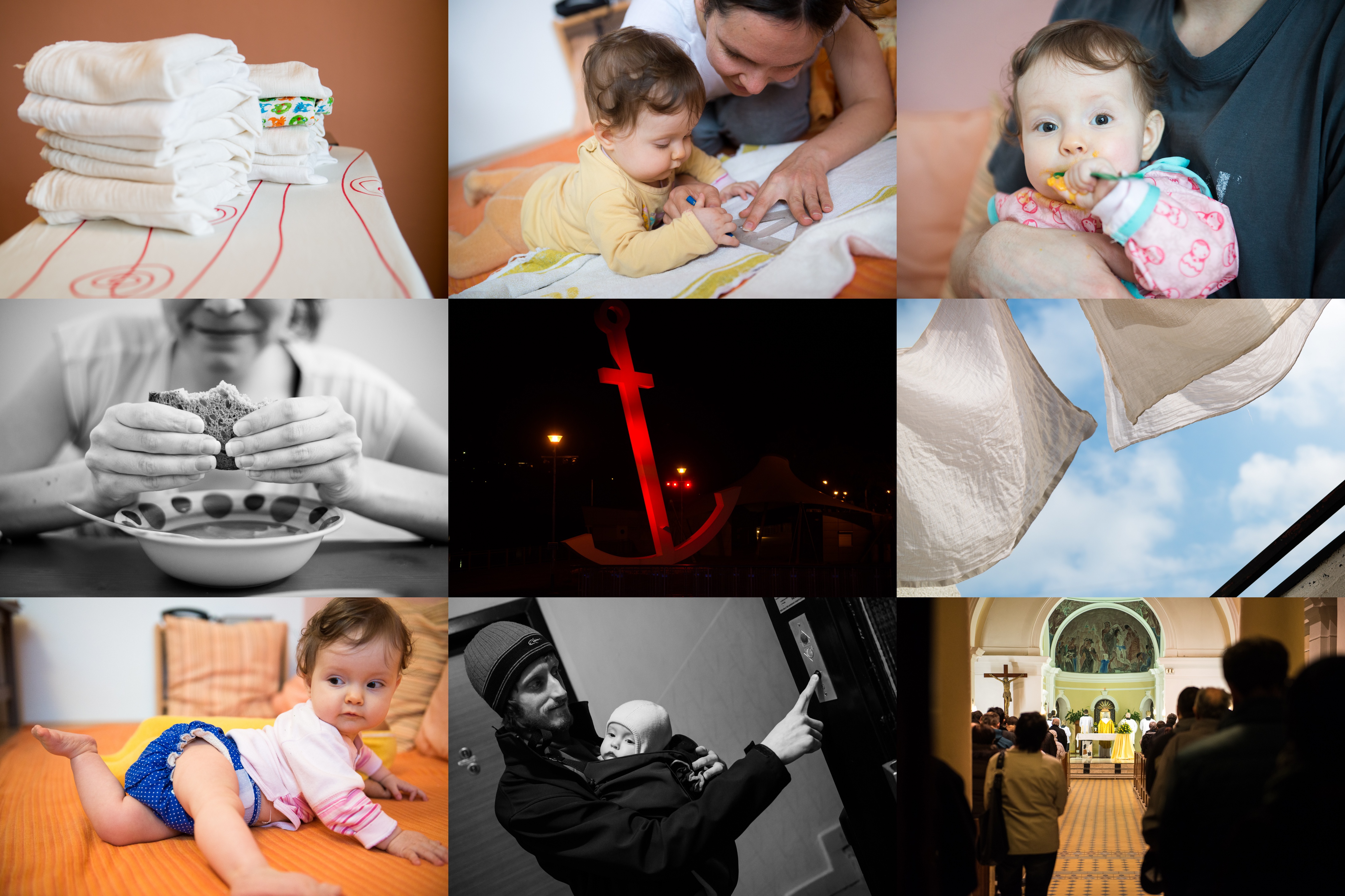 Dvanáct možností přebalení - to je jen tak na den a půl! / Snem každé vysokoškolsky vzdělané matky je ušít si svou vlastní plenu / Verunka se krmí zásadně sama, ztráty kašičky jsou povoleny / Toho dne byly topinky obzvláště neoblomné / Ač se to nezdá, foto je z odpolední procházky / Schne nám to před očima / Modelka / Jdeme vyvětrat novou nosící kapsu / V bystrckém kostele bylo zase narváno