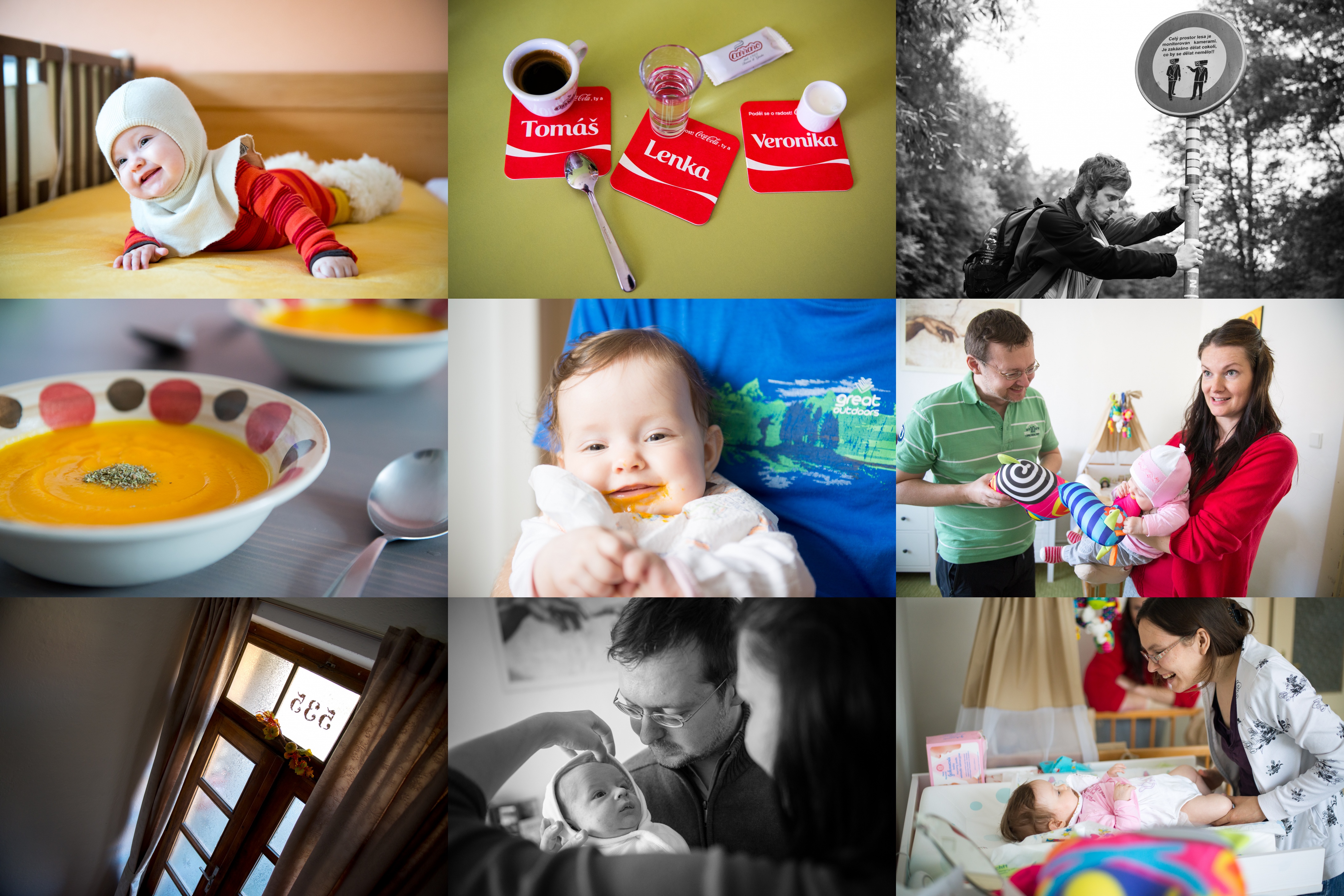 Verča se drží rad zkušených nosnic a oblékla se s příchodem podzimu celá do vlny (ovšem zapomněla se podívat na teploměr) / Každému to jeho / Celý prostor lesa je monitorován kamerami. Je zakázáno dělat cokoli, co by se dělat nemělo!! / Letos je naše oblíbená dýně Hokkaido v akci v každém druhém supermarketu, takže nám za chvíli asi poleze i ušima / Zato Verunka si dopřává dýni zásadně v biokvalitě / Verunka se snaží ukousnout hlavu Honzíčkově žirafě / V domečku číslo 535 se nám moc líbilo / Něžná náruč rodičů / Poté, co Verunka zmasakrovala Honzíčkovu žirafu, obsadila i jeho přebalovací pult