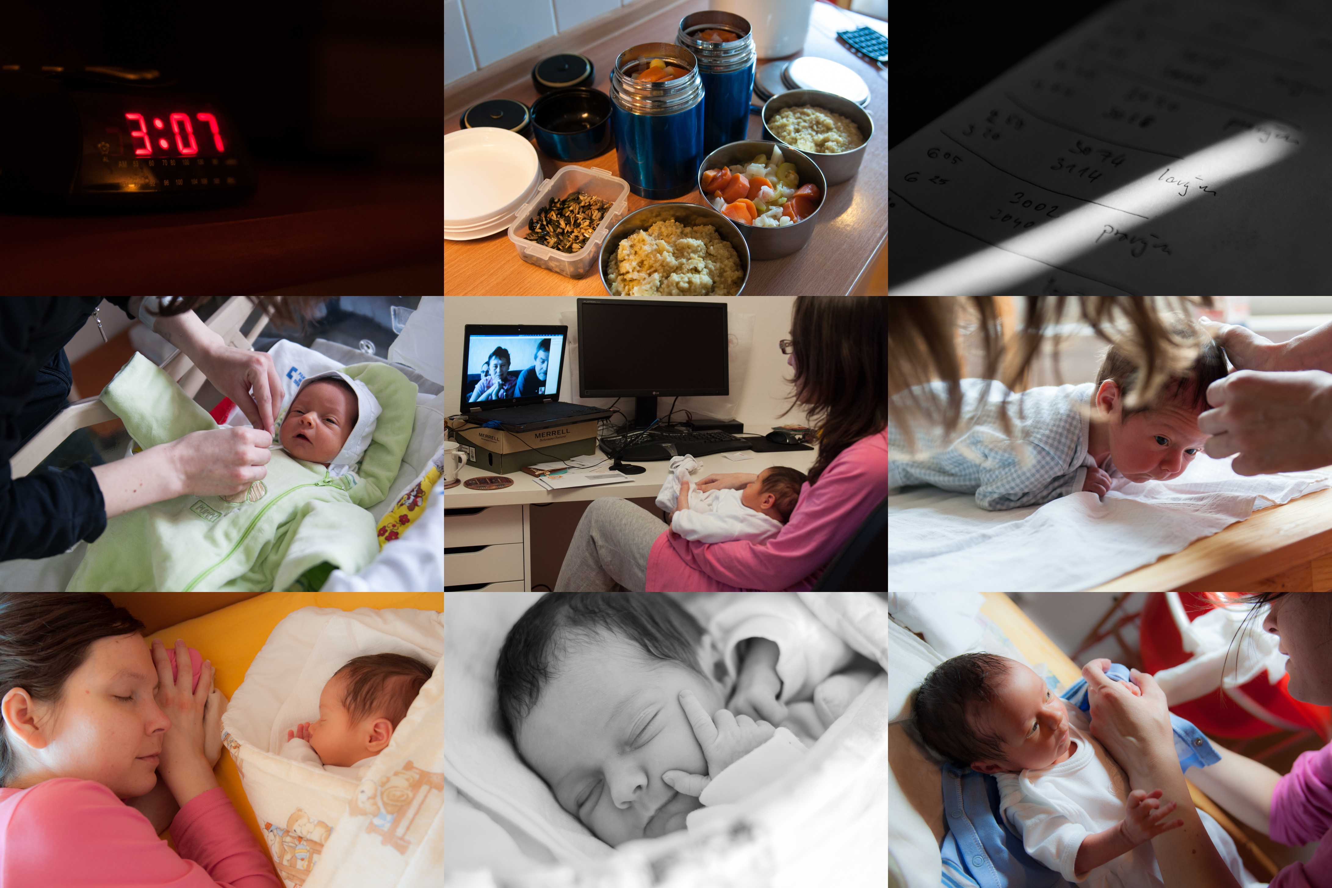 Verunka si myslí, že v nové etapě víkendů ze života bychom měli začínat fotit již nad ránem / Holky v porodnici si se dvěma rohlíky a jogurtem k snídani opravdu nevystačí :-) / Nastupující laktační demence: Miláčku, máš zapsáno, ze kterého prsa jsem pila naposledy? / Příprava na první velkou výpravu byla trochu hektická, protože se náhle zjistilo, že maminka nemá na cestu nic na sebe / Verunka poprvé vidí babičku, dědu a strýčka z Prahy / Verunka bude evidentně skvělý spartakiádní cvičenec / Pohoda s maminkou / Odpolední zamyšlení / Po prvním koupání