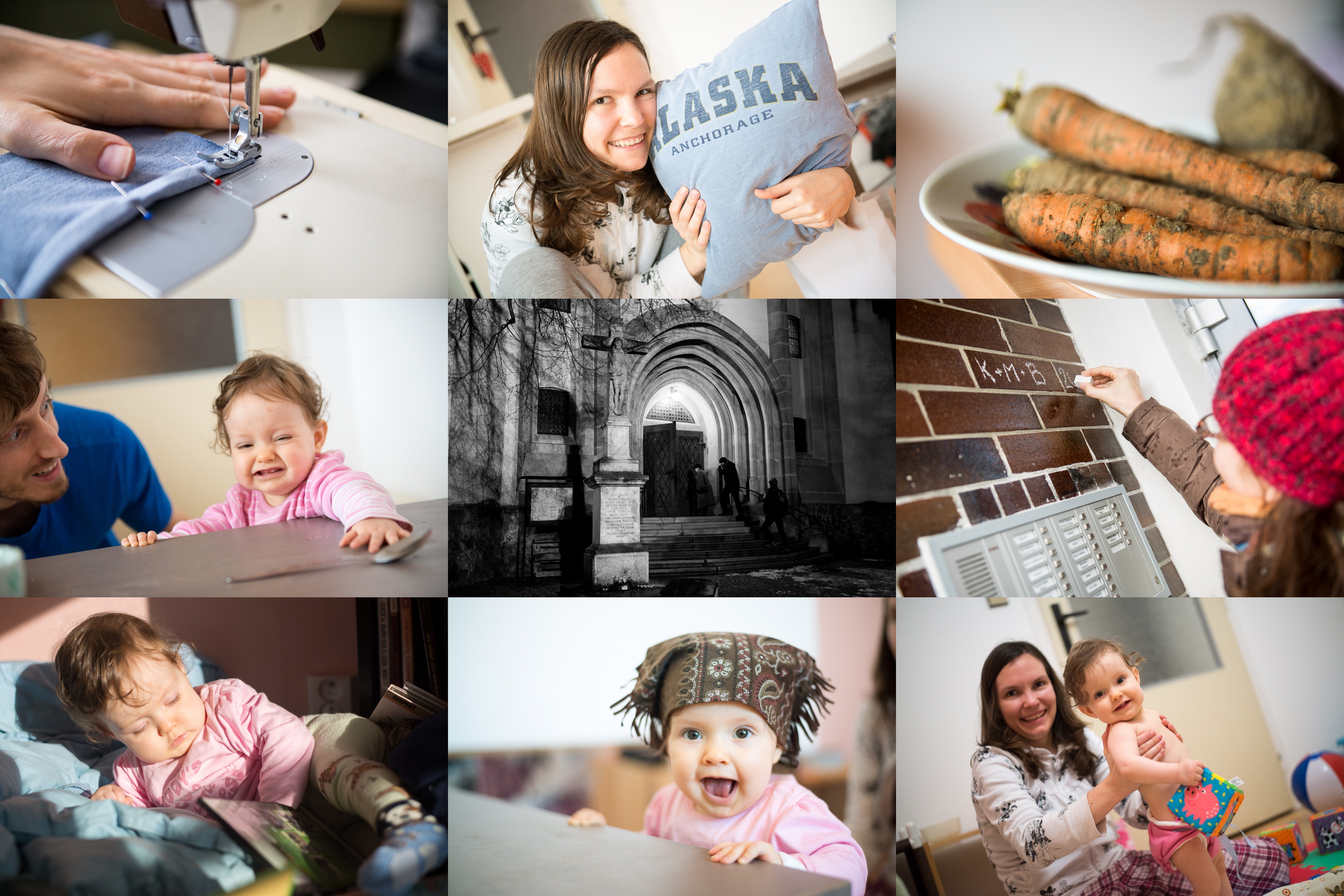 Jak jinak začít nový víkend než s čerstvě navlečenou nití? / Povolil mi rozstříhat staré triko jen pod podmínkou, že památeční nápis zůstane vcelku / čím víc hlíny, tím víc bio! / Já chci tu velkou lžíci, když už se umím postavit ke stolu! / Trousíme se na sedmou v Komíně / Věděli jste, že tato zkratka neznamená jen "Klíče, mobil, brýle", ale též "Christus mansionem benedicat"? / Verunka v dopoledním slunci reviduje naší sbírku DVD / Tak co, jak mi to sekne v maminčině šátku? / Verunka testuje první kalhotkovou plenku made by mamka
