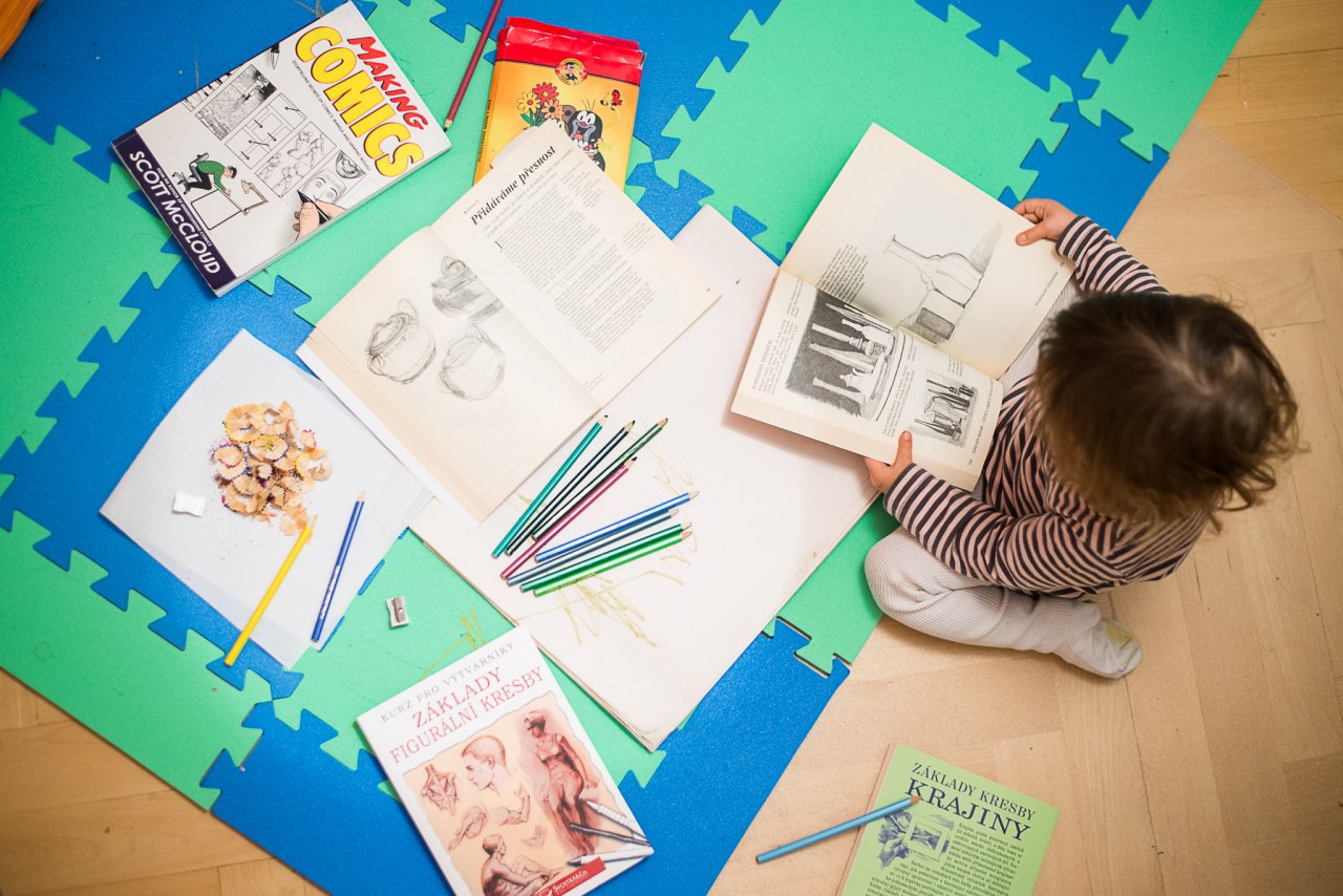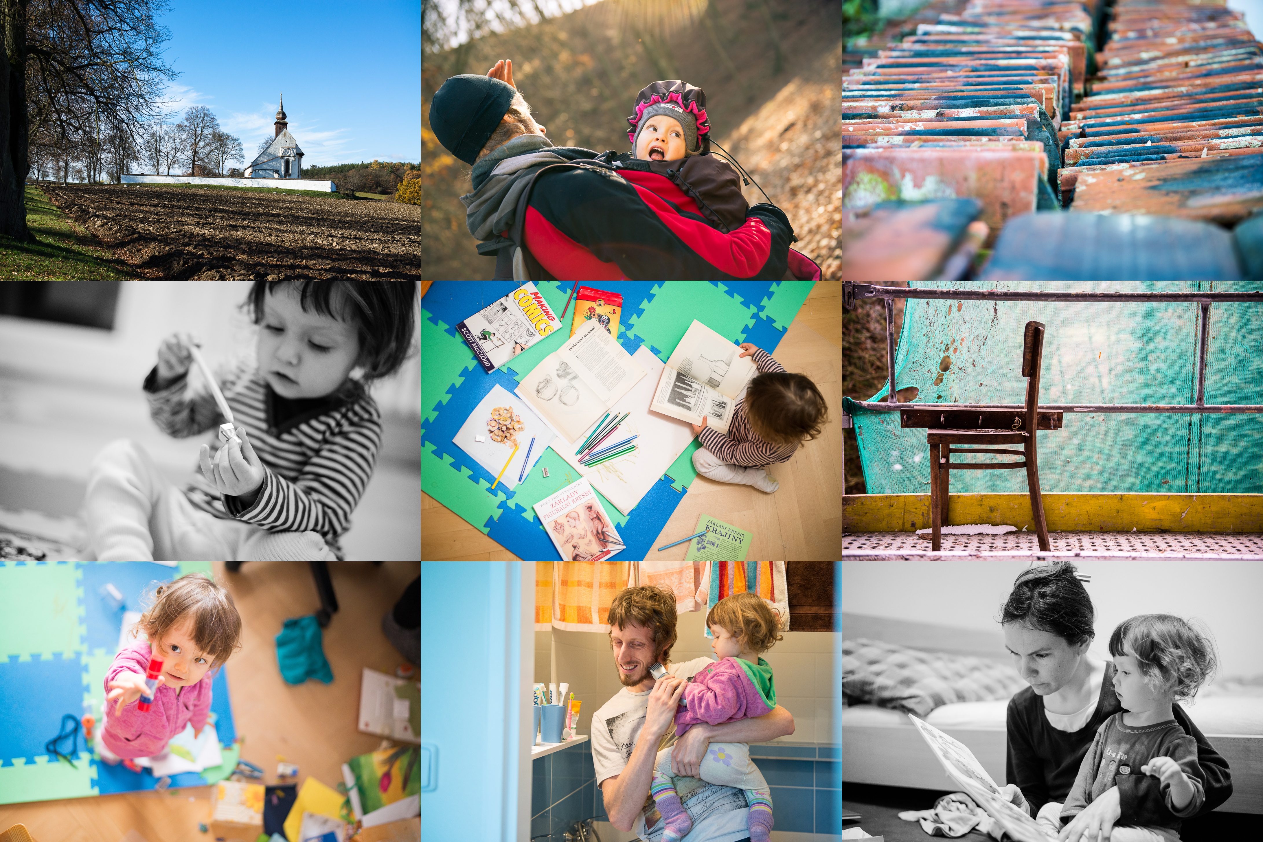 Škoda, že tento kostelíček u hradu Veveří není přístupný / Díky nízké poloze slunce trvá v tomto ročním období zlatá hodinka skoro celý den / Na myslivně Prádelna opravují střechu / Verunka a řezátko / Učíme se kreslit, začneme třeba zátiším / Pevně věříme, že výhled z okna bude brzy zase o něco veselejší / Verunka uklízí - lepidlo, podat! / Stříhání tatínkových vousů proběhlo na výslovné Verunčino přání / Večerní pohádka