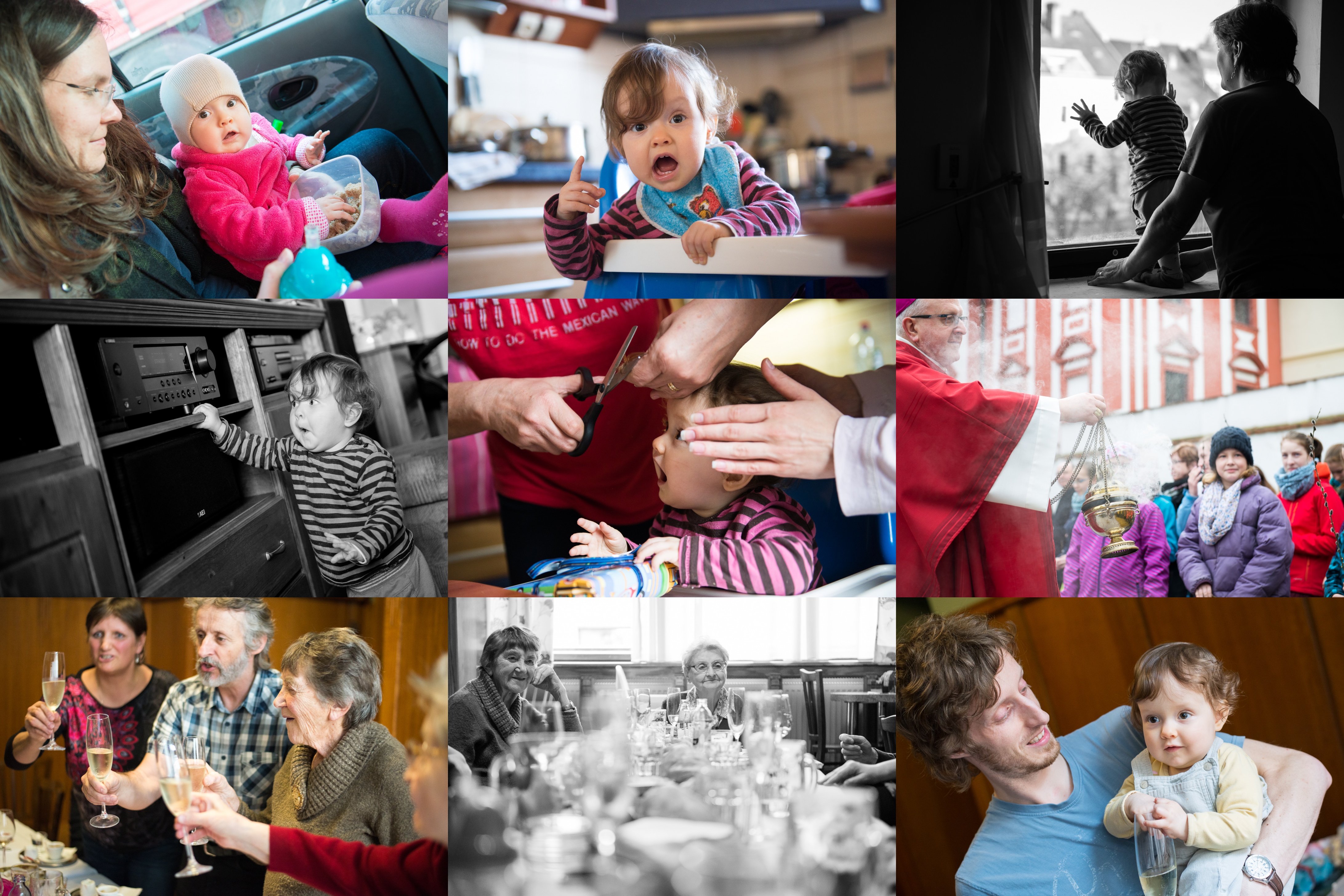 Nee, já nic, já jsem vám tu svačinu rozhodně nesnědla! / Podívejte se, jak mi to leze do očí, už je mi rok, tak mi to koukejte ostříhat! / Verča se kochá výhledem na zahradu, to v paneláku nemáme / Verčin nový ksichtík. Kdo nám objasní, co vyjadřuje, má u nás oběd / To jsou snad nůžky na plech, to nemůžete myslet vážně?! / V Litoměřicích se kadidlem nikdy nešetřilo - otec biskup žehná ratolesti / Přípitek na babiččiných 85 (z babičky je vidět jen ruka) / Babička (ta vpravo) hlídá, zda všichni dojídají / Verunka s novým sestřihem je šťastná, že konečně vidí, a chystá se koštovat šampus