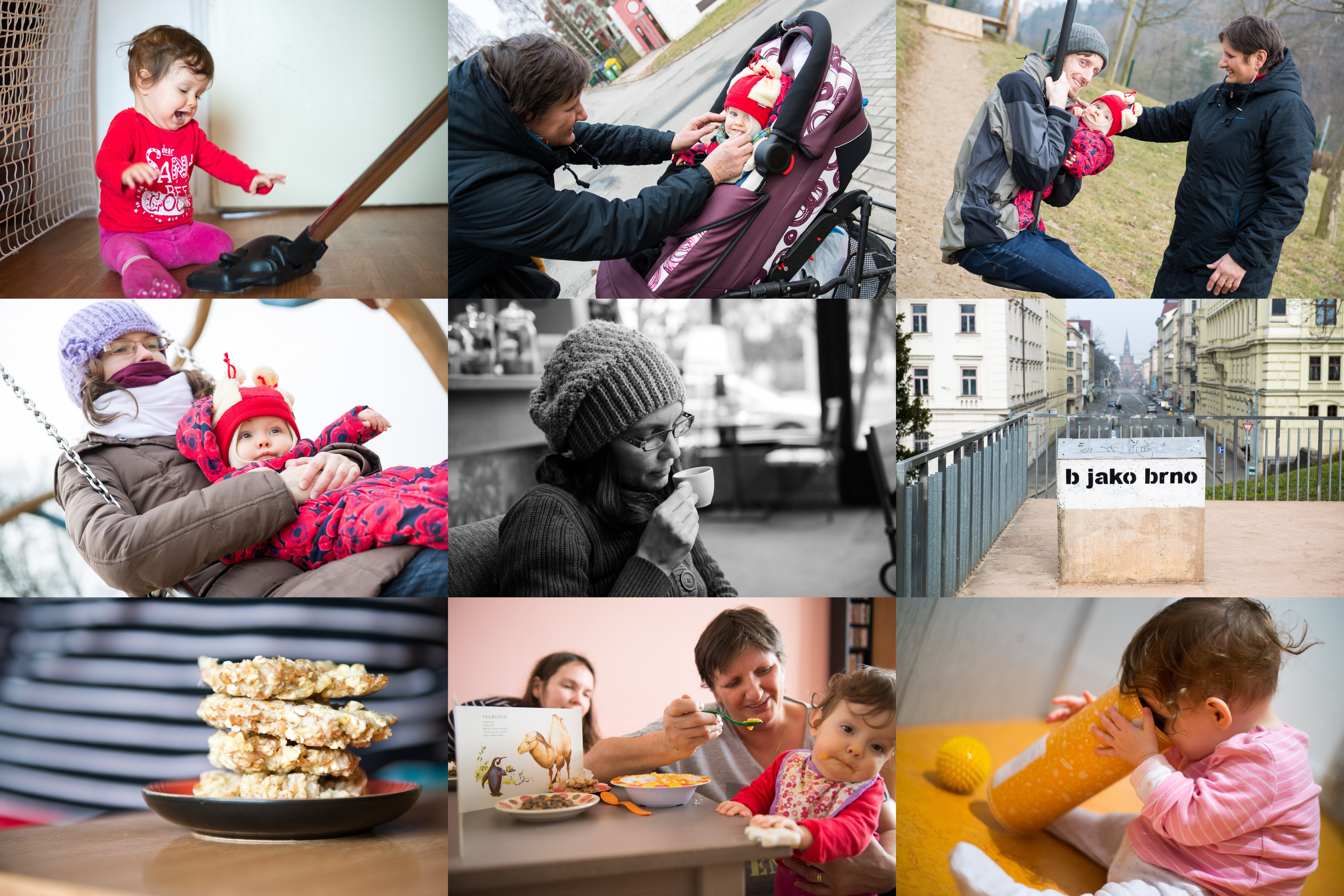 Ranní laškování s vysavačem / Babička je nadšená, že může vozit Verunku v kočárku a nemusí se omotávat nějakými nosítky :-) / Na kladku samozřejmě dospělí nesmí, ale Verča je tak lehounká, že by se to s ní ani nerozjelo / Houpání, houpání, to je legrace / Využíváme babiččino hlídání ke komorní oslavě 10-ti let od seznámení v naší oblíbené kavárničce / Tak tomu říkám vkusné graffiti / Pokus o špaldové placičky docela vyšel / S krmením si teď upřímně moc nevíme rady, už se těšíme na židli Jitro / Verče se nechtělo spát a raději čučí do tubusu