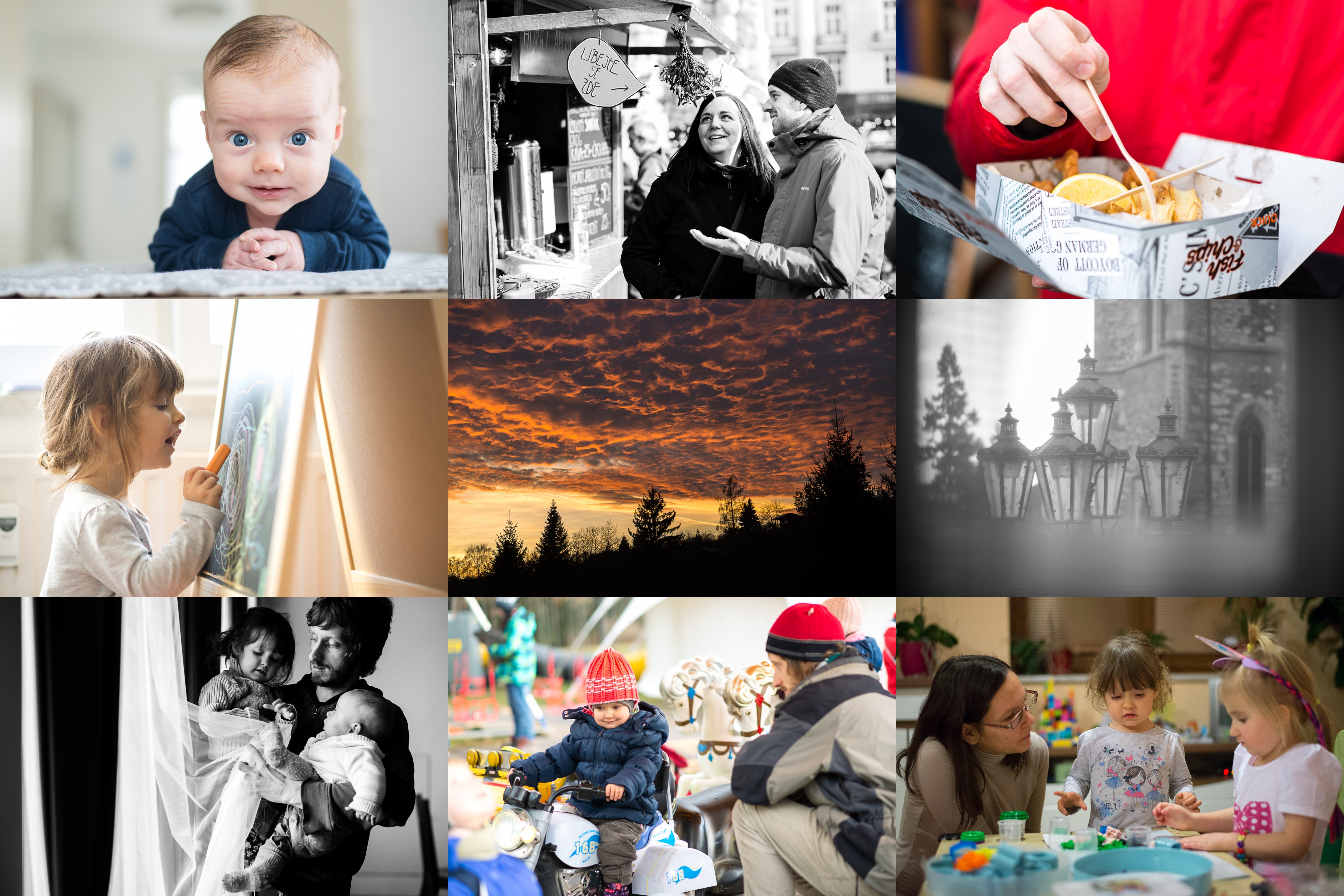 Adámek přišel na focení patřičně připraven - načesán a s naleštěnýma očima / Hele, je to tady příkazem, tak neodmlouvej! / Konečně stánek s nějakou kloudnou baštou / Tabule je hit, první dny Verča nechtěla ani jíst a spát / Být to v Pánu Prstenů, tak taková obloha rozhodně nevěstí nic dobrého / Sen o lampách na Petrově / Při nácviku rodinného fota je důležité, aby se nikdo nezranil / Stepovali jsme před kolotočem již pár minut před spuštěním a díky tomu získala Verča nejprestižnější stroj / Modelínování s Móňou