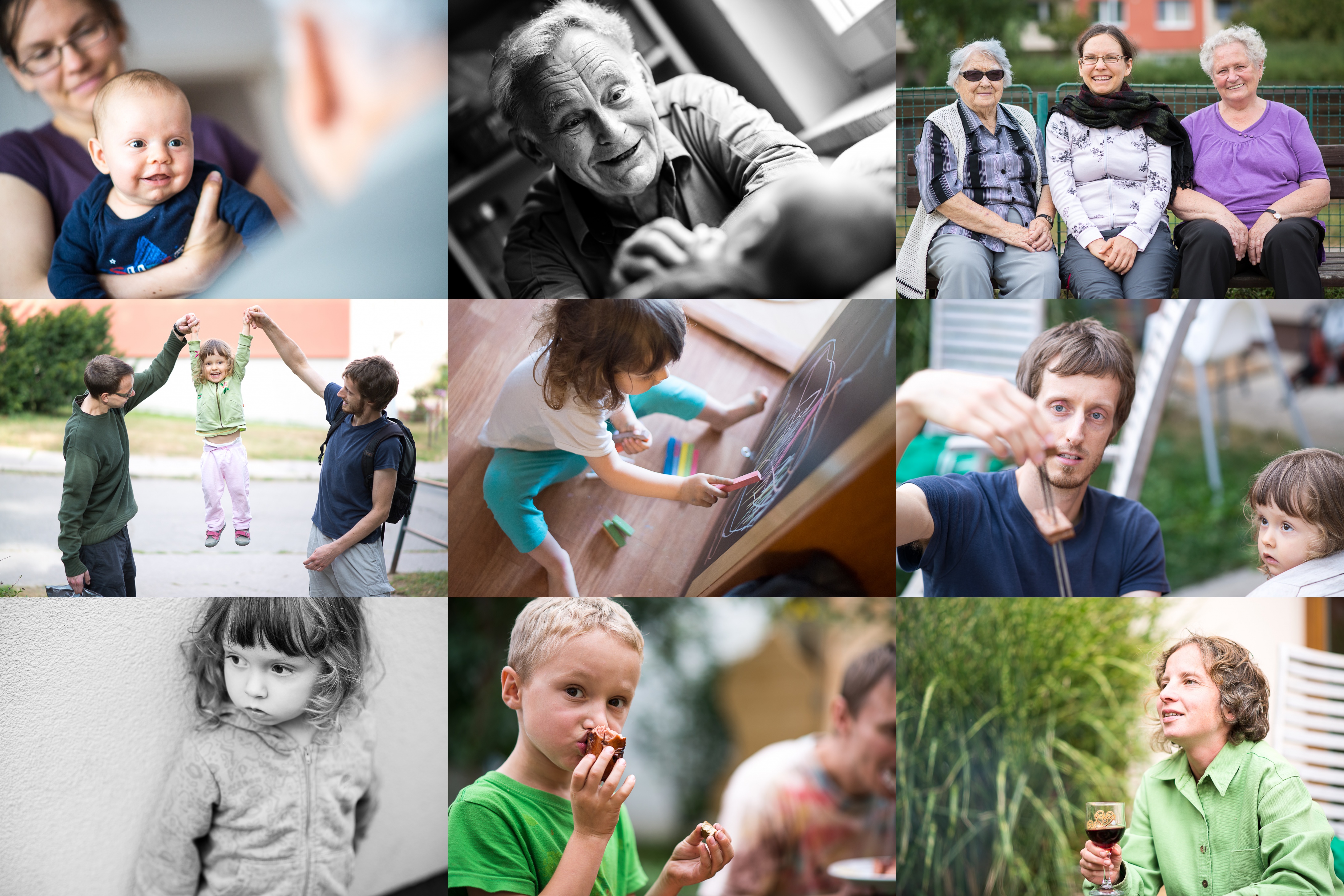 Takhle se Radovánek usmívá na pradědu / A takhle praděda na Radovánka / (Pra)babičky / Skákat! Hodně! / Verunka se konečně dočkala - rodiče se smířili s vidinou křídového prachu všude a dopřáli jí domů tabuli / Tati, jsi si jistý, že to tofíčko půjde opéct? / Modelka / U Míši nad tofíčkem zvítězil špekáček / Debata o nádraží jedině nad sklenkou červeného