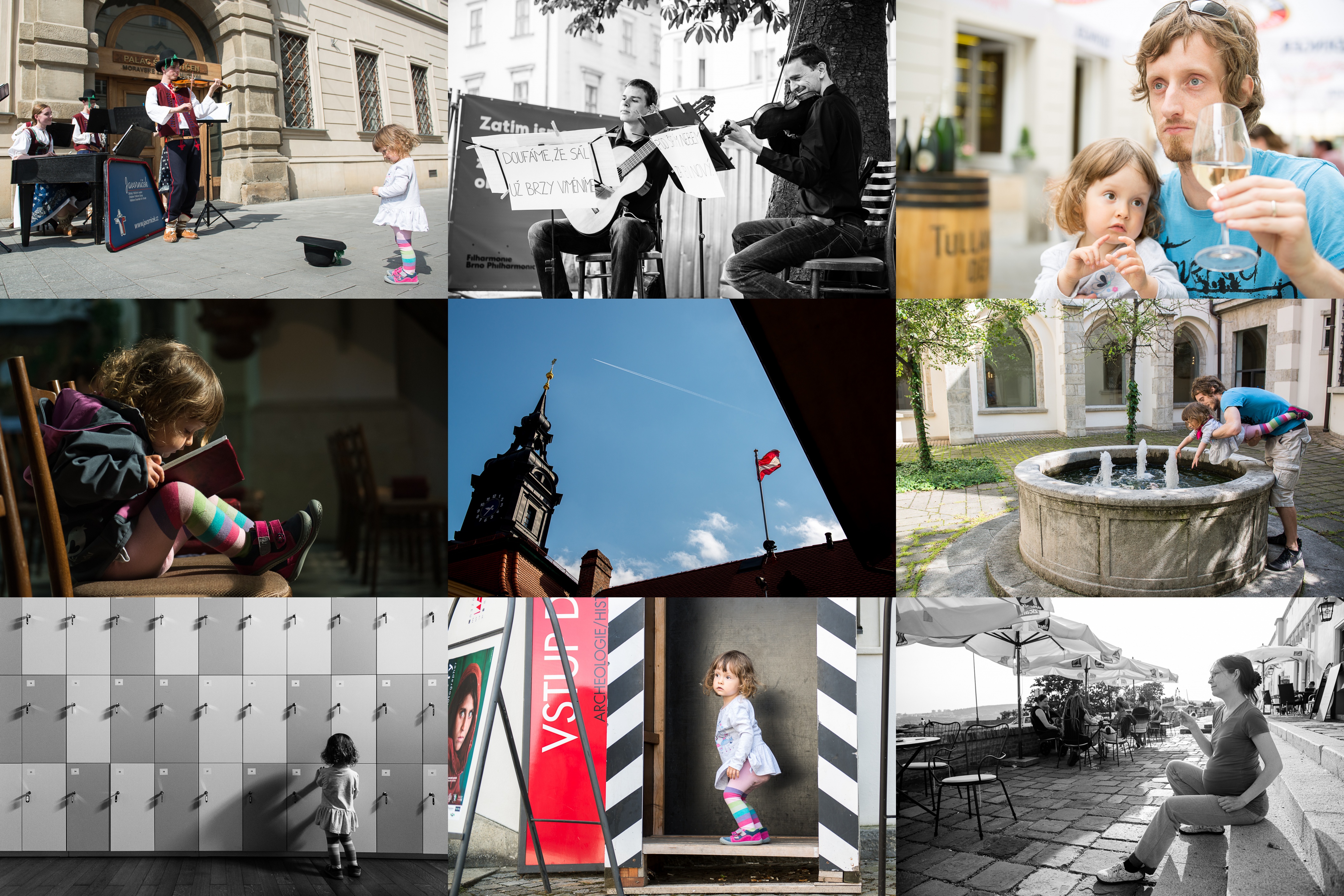 Maraton hudby Brno - Javorníček si od Verunky vysloužil nějakou tu korunku / Pro nás jasná jednička - velmi komorní vystoupení šarmantních filharmoniků / Verunka zoufale touží ochutnat víno na zahrádce u Divné paní / Tady jsou nějaký noty! / Kompozice s věží letadlem a vlajkou na Nové radnici / Objev dne - utajené atrium za křížovou chodbou / Na výstavě fotografií pana McCurryho na Špilberku Verunku nejvíce zaujaly šatní skříňky / Zatím ještě celkem nevinný taneček / V Café Špilberk se sklenkou Chardonnay v ruce se člověk cítí tak nějak nad věcí