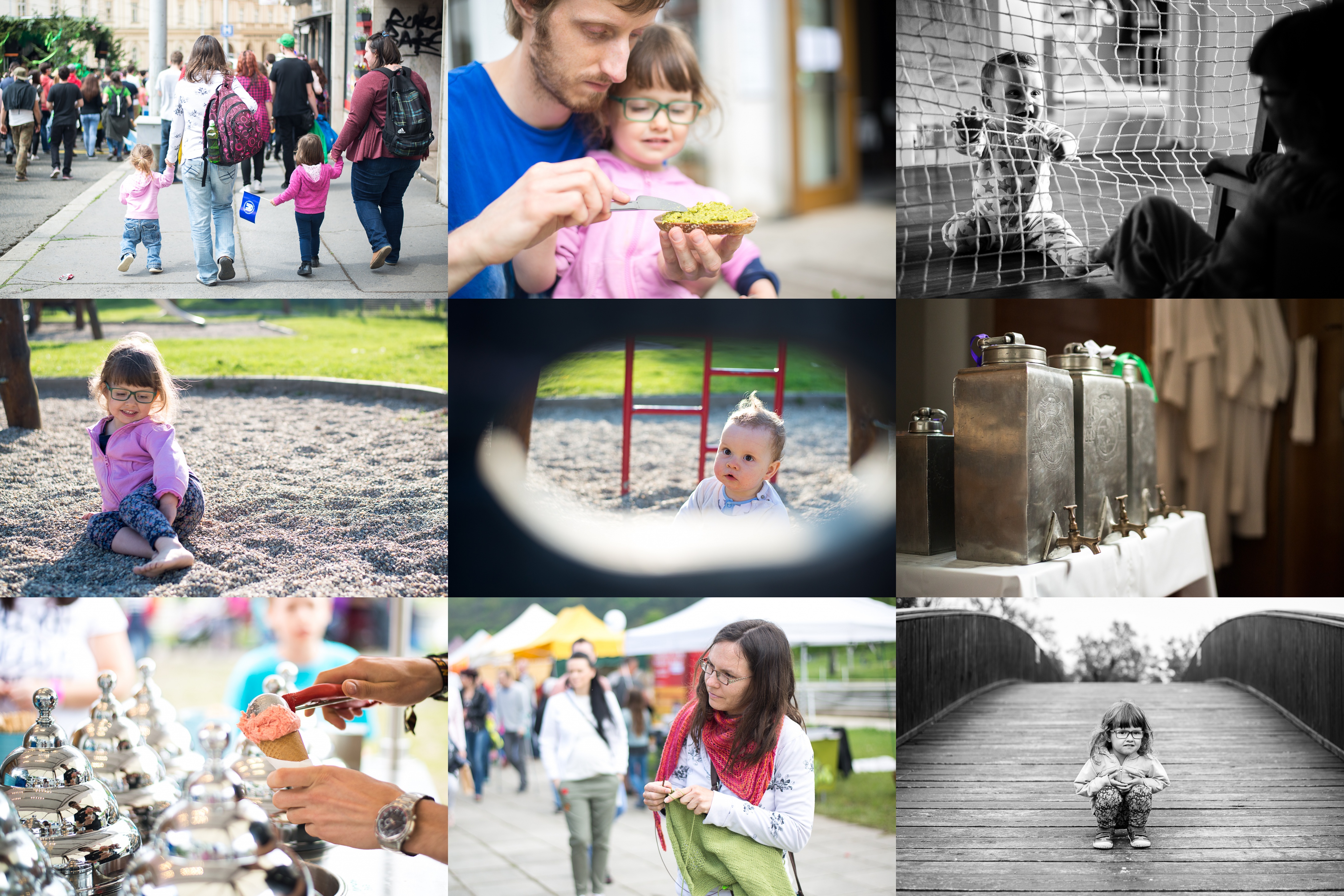 V Majálesovém průvodu se nám nejvíc líbil zelený alegorický vůz Mendelu se skupinou Jelen / Co jiného si dát na zub v Café Mendel, než hráškovou pomazánku? / Radovánku neboj, již brzy taky okusíš život za sítí / Zahajujeme bosonohou sezónu / Chudák Radovánek místo avizované maminky vidí v díře pouze objektiv / Nechali jsme si vysvětlit, že tyto krásné kanystry v sakristii katedrály obsahují svaté oleje pro celou diecézi / Den těhotenství - u stánku Tutti Frutti je jako obvykle největší fronta / Supermatka mezi oky po očku kontroluje co provádí rozjívená Verunka na pískovišti / A když už na nás té rušné akce bylo moc, šli jsme se ztišit za lávku
