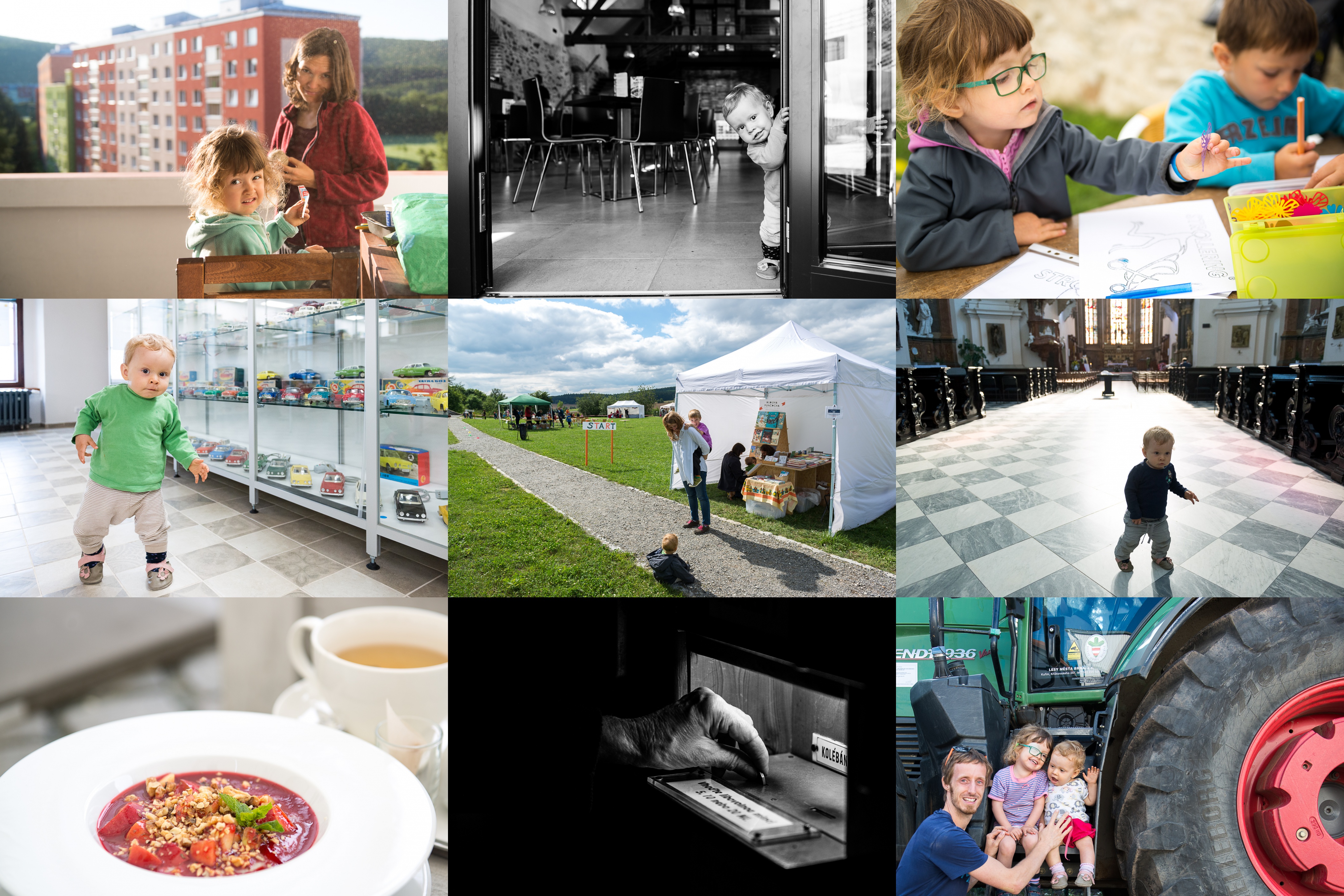 Než vyrazíme na výlet, je ještě potřeba na balkoně vyrobit křídy / U muzea autíček v obci Příseka mají pěknou kavárnu / Verunka tvoří, zatímco rodiče soutěží ve strolleringu / Muzeum bylo ideální pro trénink techniky chůze / U stánku knihkupectví Dlouhá punčocha jsme trávili hodně času / Chodící Radovánek poprvé v katedrále / Sice nevíme, co je to Čirok, ale kaše z něj vypadá v Café Momenta dobře / Po letech u jesliček ve Vranově, kolébání i hudbu jsme otočili několikrát / Hele děcka, to kolo je větší než tatínek!