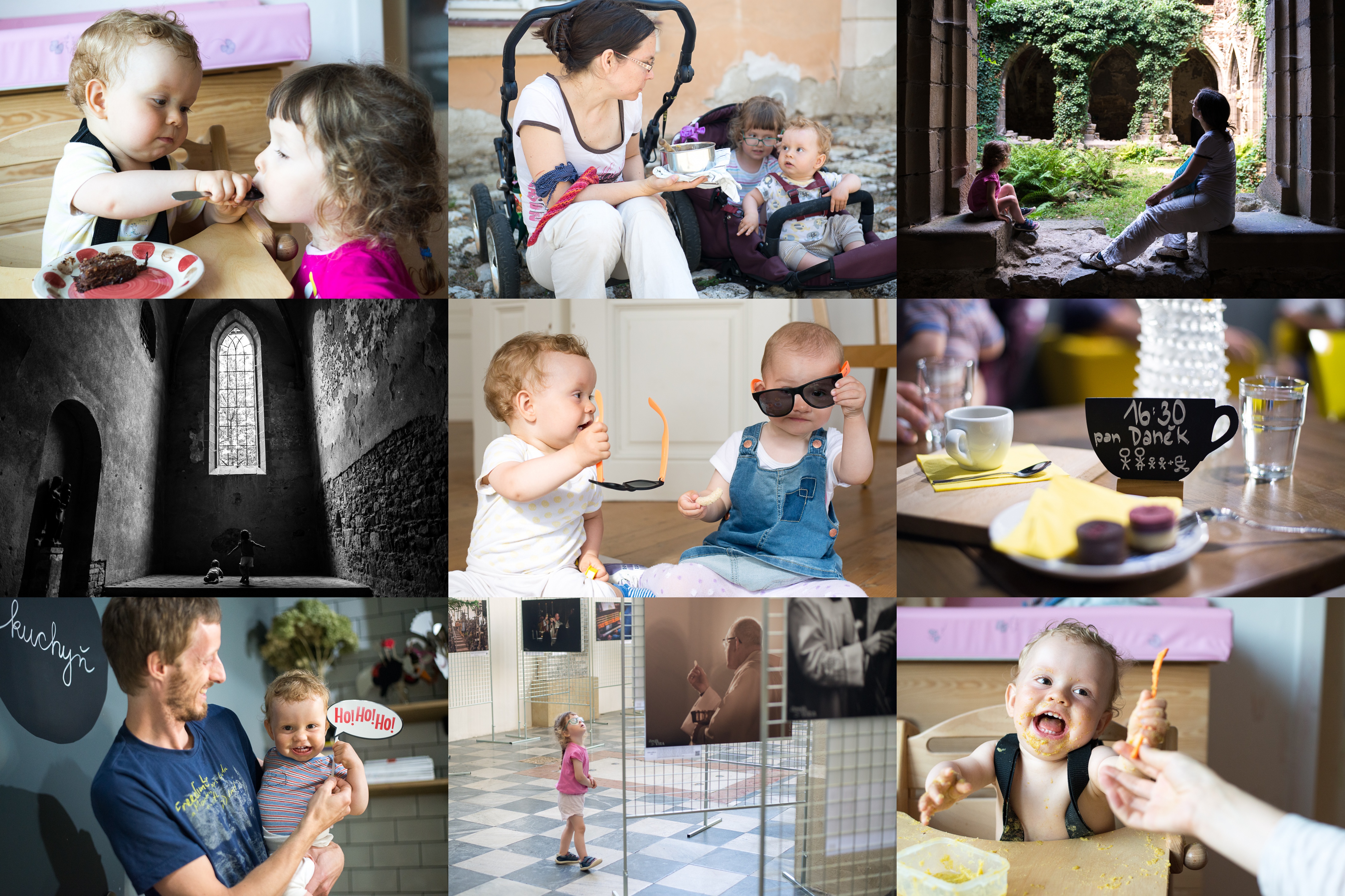 Radovánek je natolik galantní, že svůj RAW narozeninový dortík ani neochutnal a hned jím začal krmit sestřičku / Obědový punk u zámku v Mikulově / Konečně jsme se podívali do Rosa Coeli / Divoký tanec v nejzachovalejší části kláštera / Hele, nebudou Ti ty moje brejle líp? / V Coffee bar MyMiKa jsme se hned od začátku cítili jako doma / Kavárna si nás mimojiné získala i širokou nabídkou fotorekvizit / Verunka obdivuje velkoformátové fotografie na výstavě Člověk a víra / Radovánek je velmi vděčný strávník