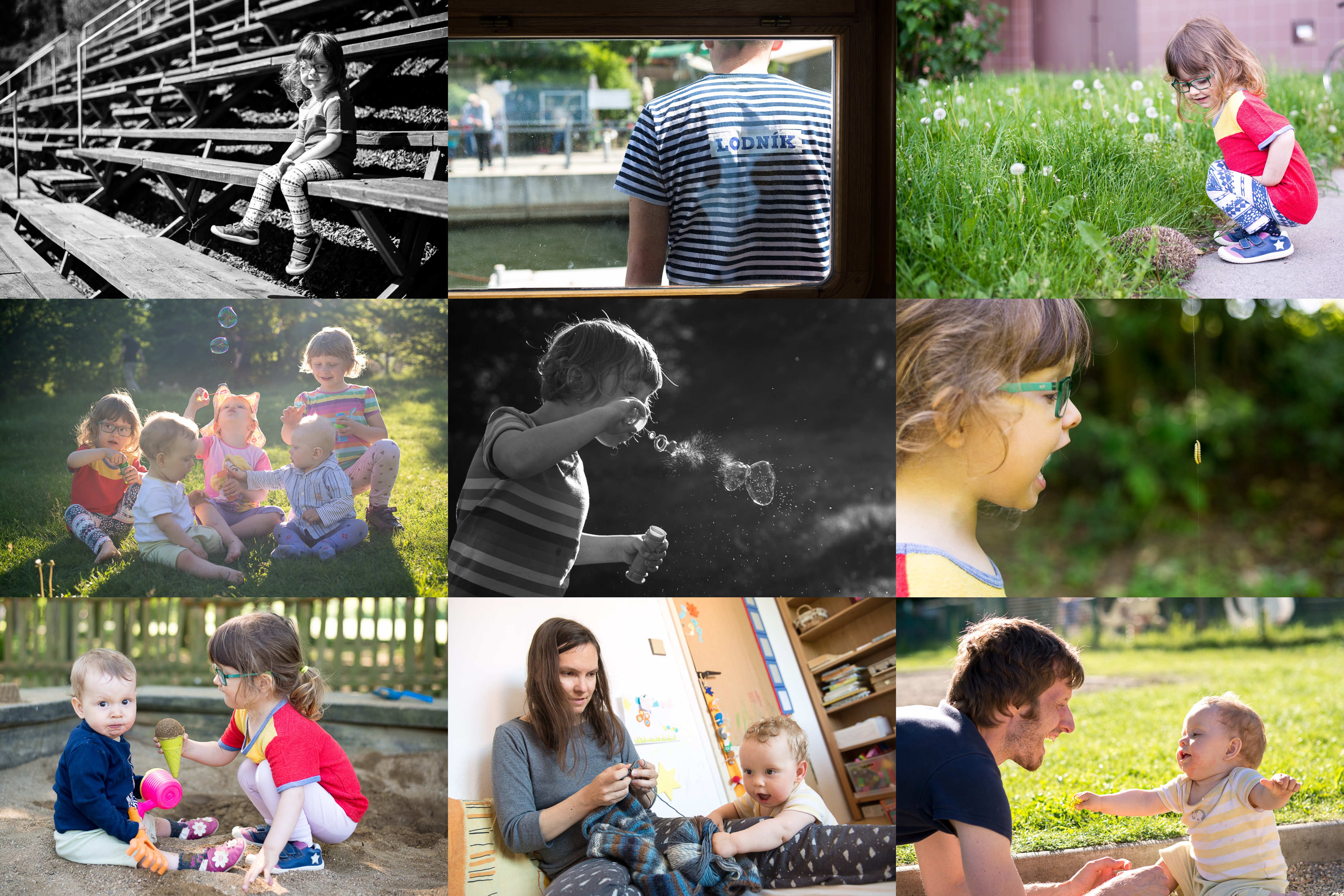 Pohoda na Sokoláku / Přivázal jste ten parník opravdu dobře, pane Lodník? / Náhodné setkání cestou ze sámošky - a fakt píchá! / Bublifuková party u nás na hřišti / Detailní studie Sašenčiny bublifoukací techniky / Verunka zjišťuje, že ne všechny zvířata lze zastrašit křikem / Vanilkovou Radovánek asi nerad / Radost z ukořistěného klubíčka / Víkendový dojezd u nás na hřišti - zatímco Verunka běhá tam a zpět pro květy řepky, kluci si užívají večerní slunce