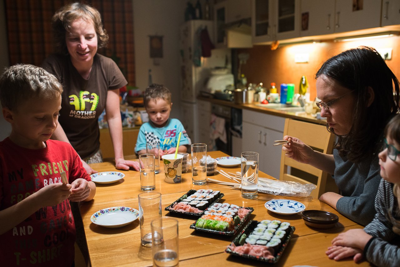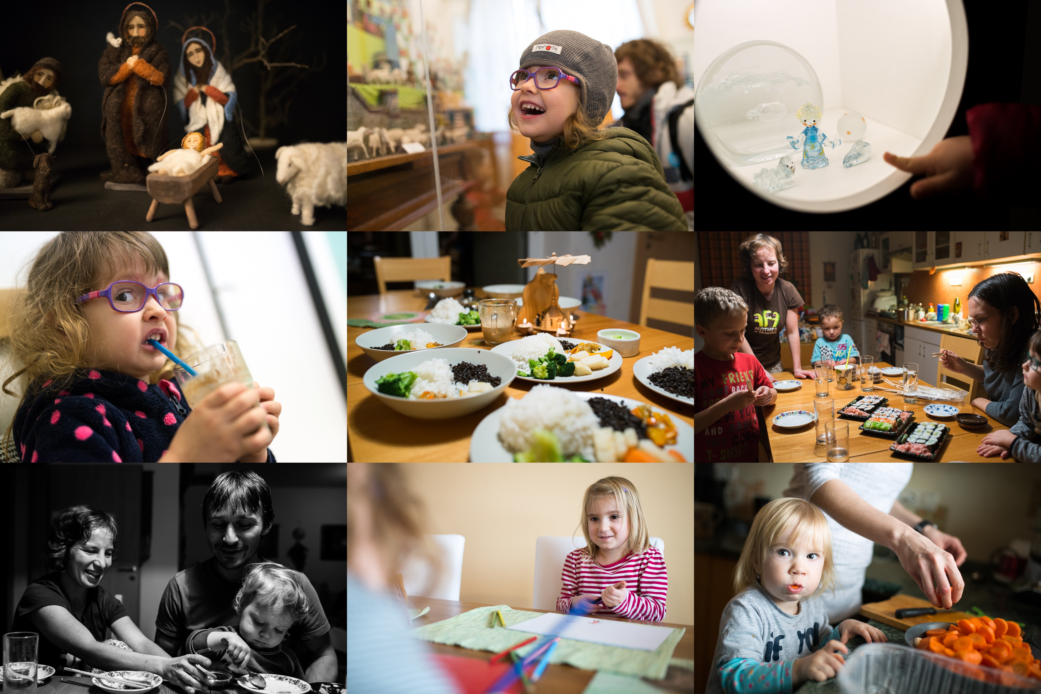 Výstava betlémů fascinovala velké... / ...i malé návštěvníky / A ve sklepě nás čekal zlatý hřeb v podobě skleněných malých princů / Ale copak, kakajíčko z kešu-kokosového mléka ti snad nechutná? A s trochou agávového sirupu by to bylo lepší? / To je panečku talířů, když se sejdou dvě rodiny! / Decentní oslava decentního výsledku prvního kola prezidentské volby / Radovánek konzumuje sushi nejraději u velkého Radovana na klíně, je k tomu ovšem potřeba ještě asistentka Hanka / Móňa s Verčou kreslí dárek k svátku pro Radovánka / Liňdo, ty jíš tu mrkev jen tak bez chleba?!!