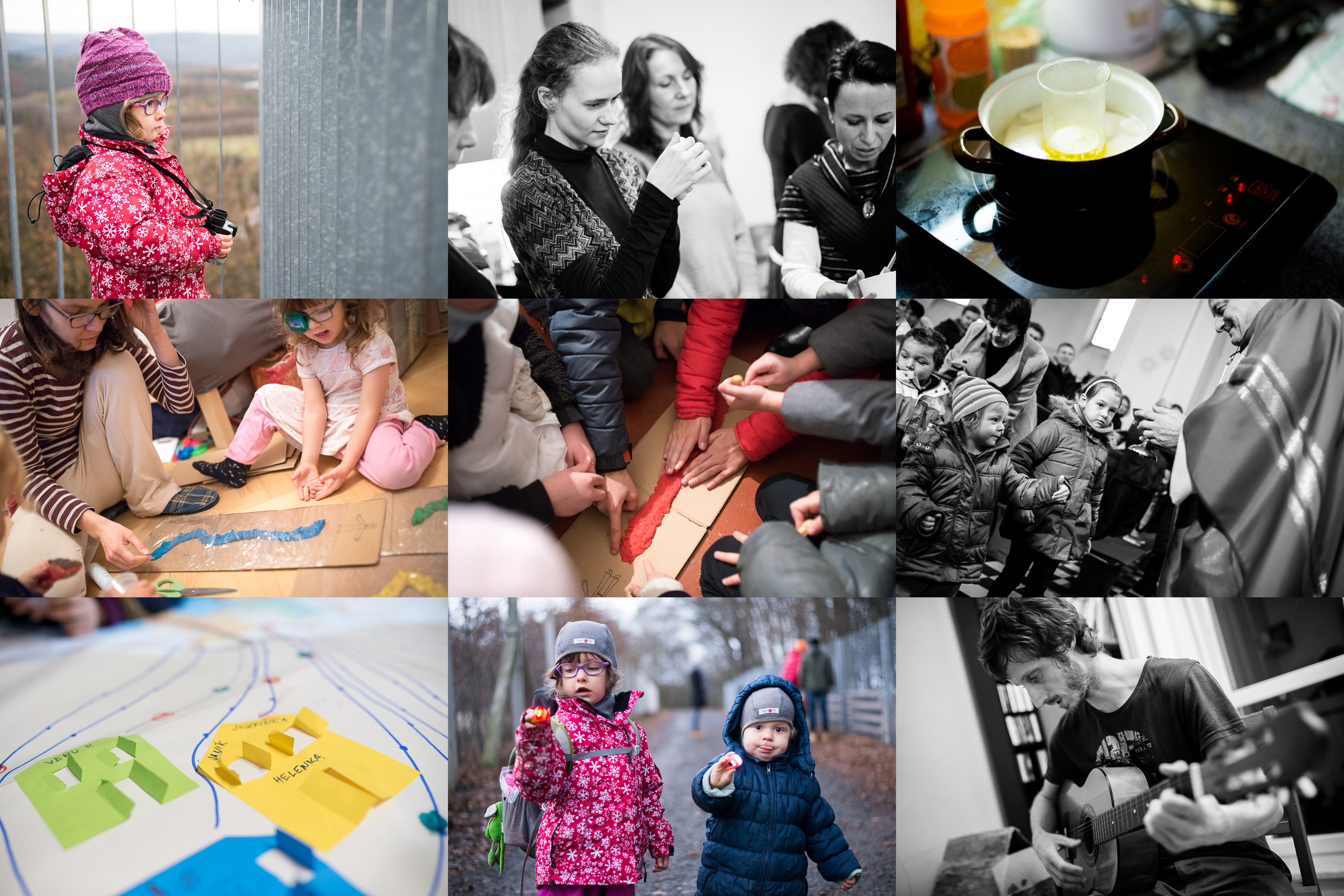 Vidina výstupu na rozhlednu a pohledu do dáli Verunku motivuje natolik, že se sama a rychle oblékne a vyrazí z domu / Ženské adventní setkání na faře, tentokrát ve znamení vůní - vyráběly se krémy... / ... a balzámy na rty. Vosk včelí i karnaubský je třeba nejprve pořádne rozpustit ve vodní lázni / Chystáme cestičky, klikaté a hrbolaté. A balíme je do potravinářké folie, aby nám nevyschly. / A aby je děti mohly druhý den pro Pána dobře vyrovnat. / Radost z toho, že miska s hostiemi zůstala po celou cestu k oltáři nevysypána. / Na adventní nástěnku přibyly další domečky. / Podvečerní procházky ve znamení světýlek. / Když děti ulehnou, může tatínek v klidu kytarat.