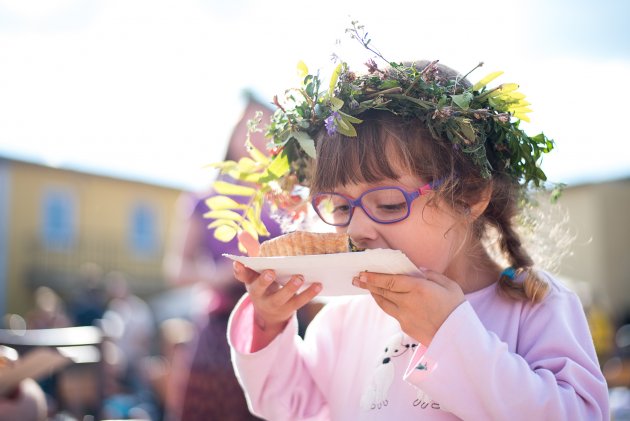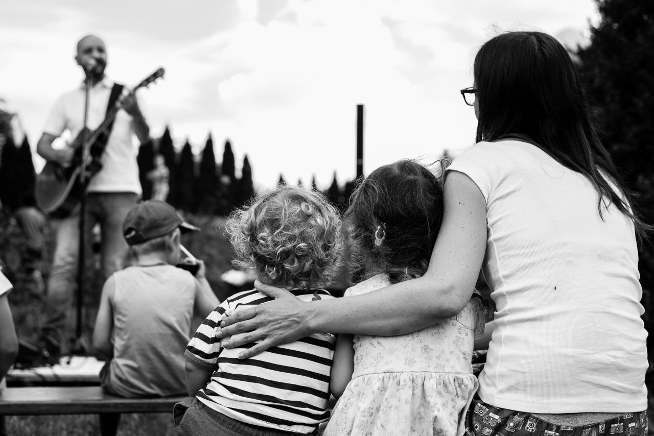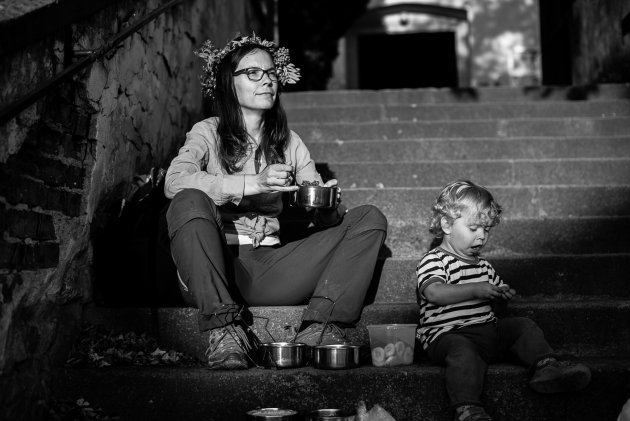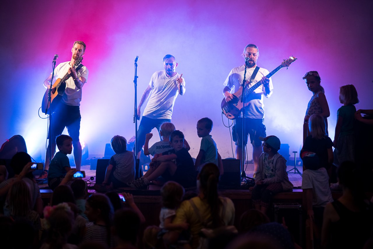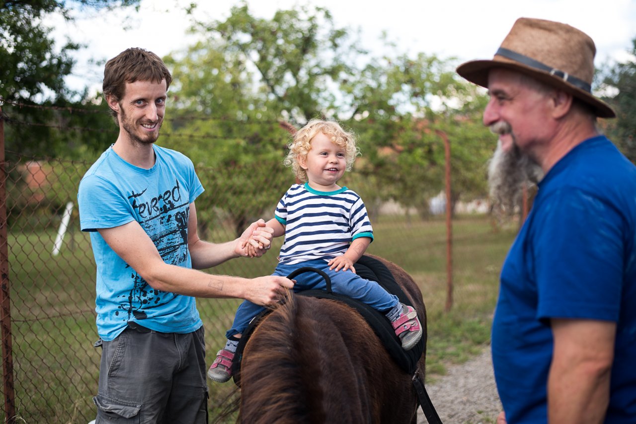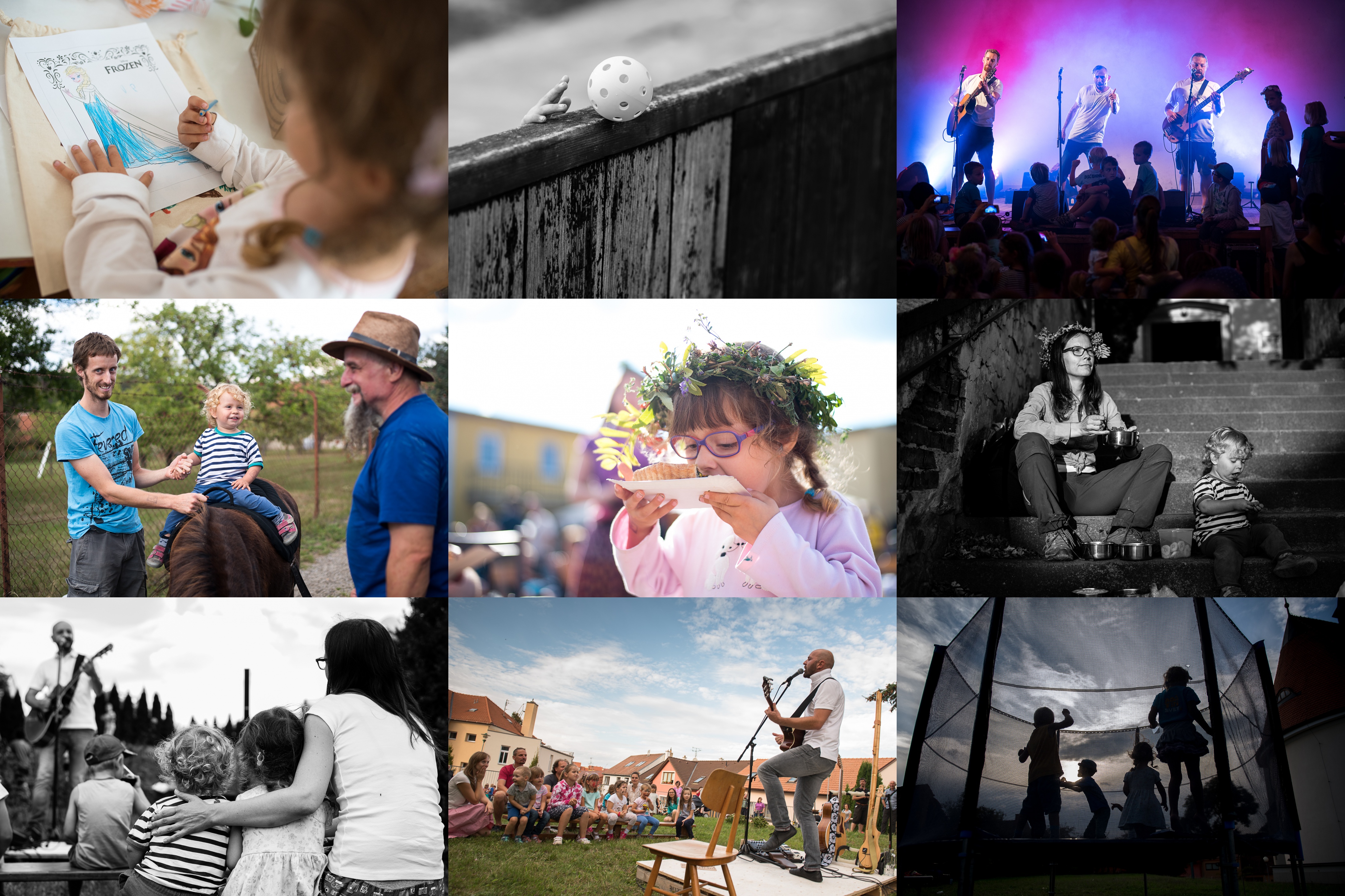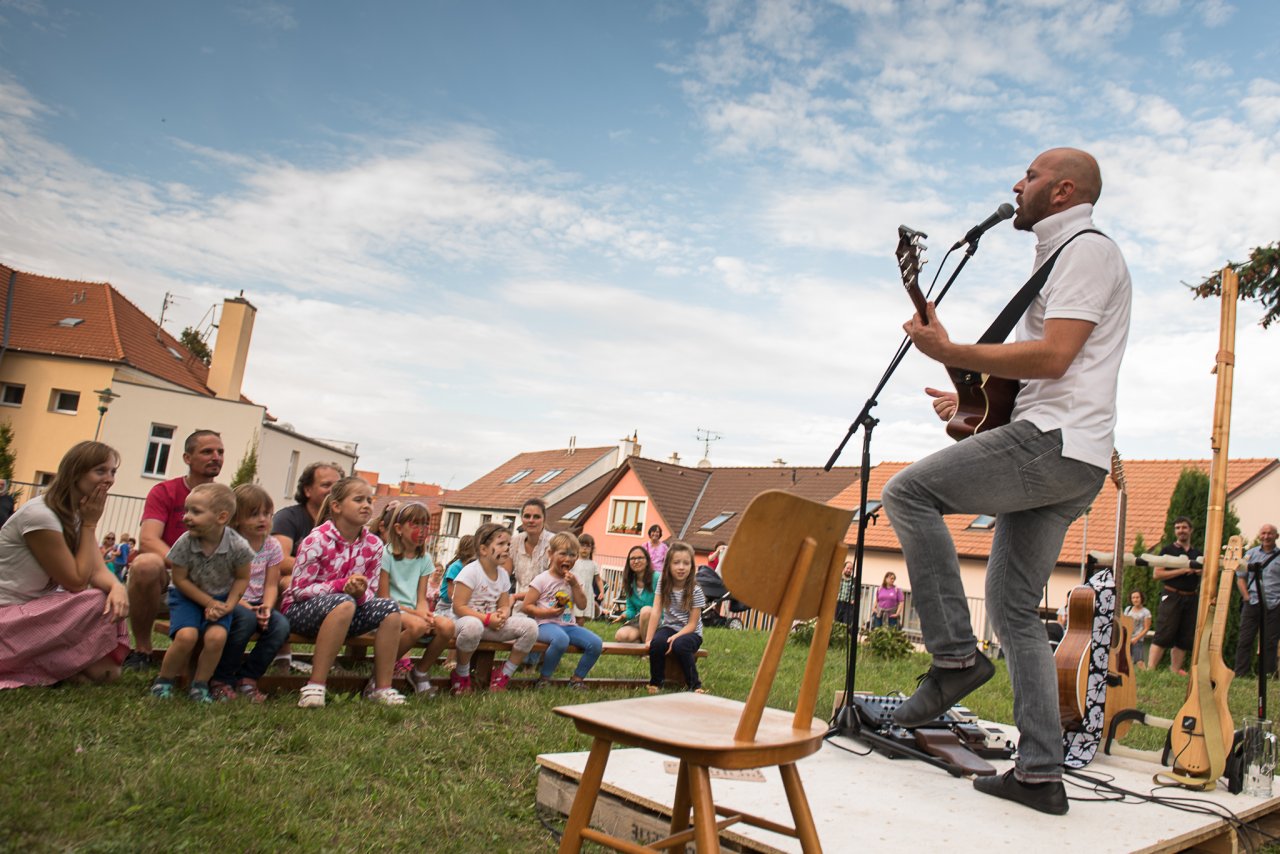 Těm princeznám se prostě nejde vyhnout, když je má na tričku každá druhá holčička u nás na sídlišti :-) / Hurá, Radovánek dorostl poslední centimetr potřebný k překonání laťky! / Stihli jsme aspoň druhou půlku skvělého Bombarďáka / Na divokou jízdu na mule si Radovánek zatím netroufl, tak aspoň zapózoval / Tento výborný koláč nám na festivalu Mezilesy osobně prodala stejná paní, která vaří pro Verunčinu lesní školku / V poslední době jsme si oblíbili poklidné outdoorové večeře, zde například na schodech kostela v Babicích přežvykujeme mezi jednotlivými pokusy Radovánka o přelet schodiště / Novopečení skalní fanoušci Pavla Helana / Když nosíme s panem muzikantem stejnou značku placatých bot, je to něco podobného, jako když jsme spolu pásli husy? :-) / Slunce již pomalu zapadá za hlavy malých farníků