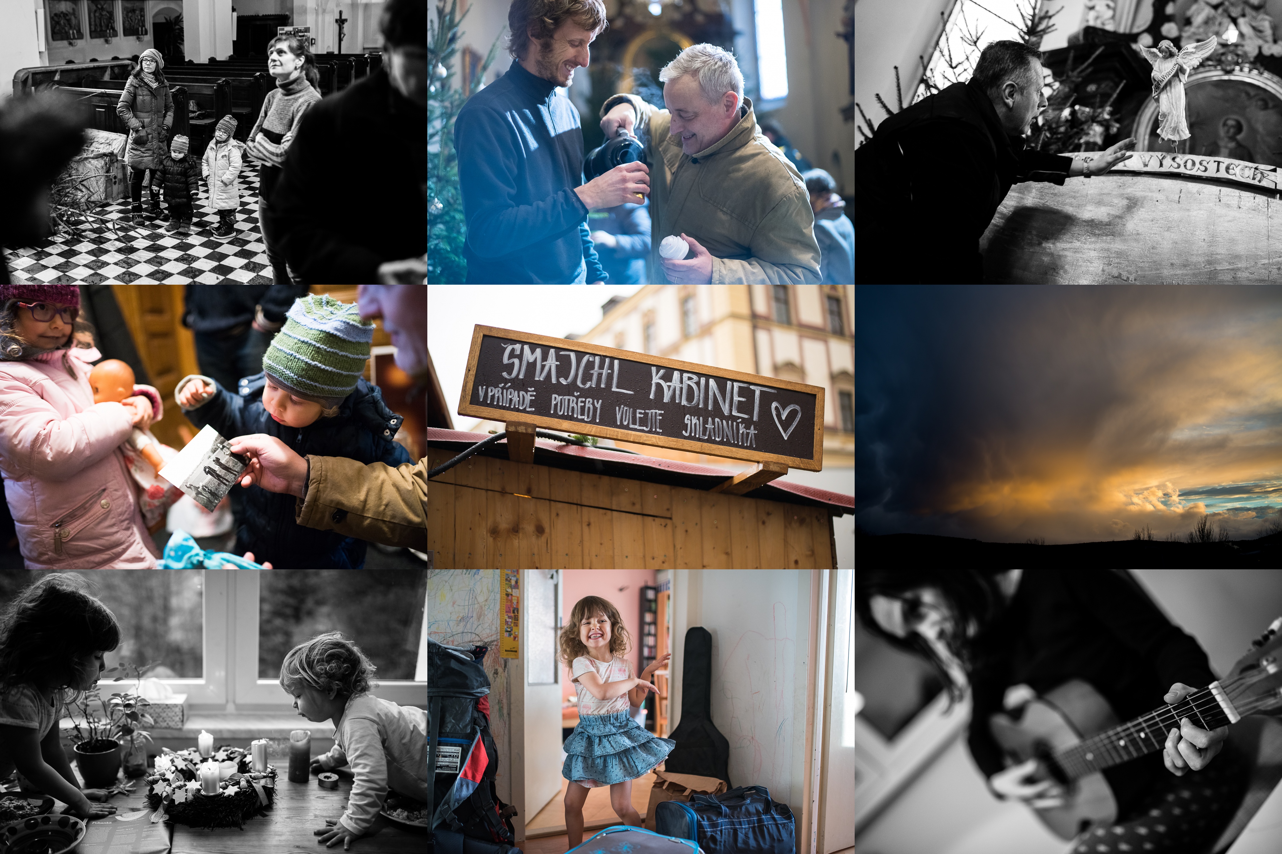 Tak co myslíte, vejde se tam ten strom nebo ne? / Říkal jsem po dně, Marceli! / Anděl drží - Sláva na výsostech! / Rozjímání nad Marcelovou oblíbenou fotkou z drakiády / To je pech, Tom je zrovna na nákupech ve městě sám! / Tak co myslíte, která strana zvítězí? / Zábavná aktivita - sfoukávání sfíček - nás provázela celým adventem / Máme sbaleno, je čas tančit radostí! / A již v Praze ještě před spaním pár akordů