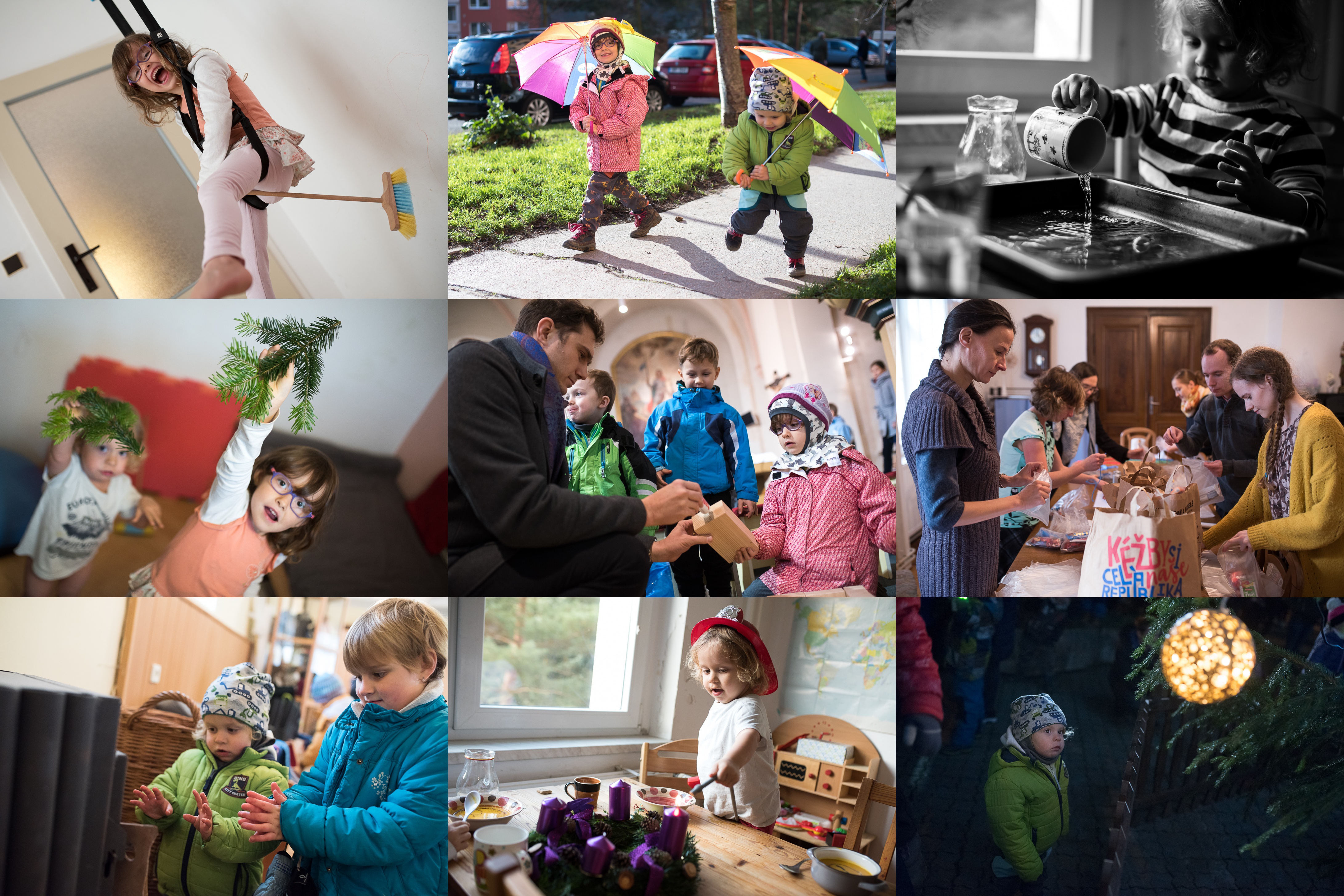 TRX zavěšené na hrazdě - nekonečný zdroj zábavy, zvažujeme instalaci ribstolí... / Vycházka s paraplíčky / A Radovánek přeléval a přeléval a byl šťastný... / Zbytky po výrobě adventního věnce lze mimojiné použít pro mezigalaktické lety... / O první adventní neděli stavíme první patro jesliček / Při výrobě 120-ti balíčků pro Mikuláše je potřeba maximální efektivita výrobní linky / Po řádění u sudu s ledem na farním dvorku přijdou kamýnka vhod / První adventní svíčka zapálena a náš domácí hasič se hned chopil příležitosti / Poprvé jsme byli u rozsvěcení vánočního stromu v Komíně