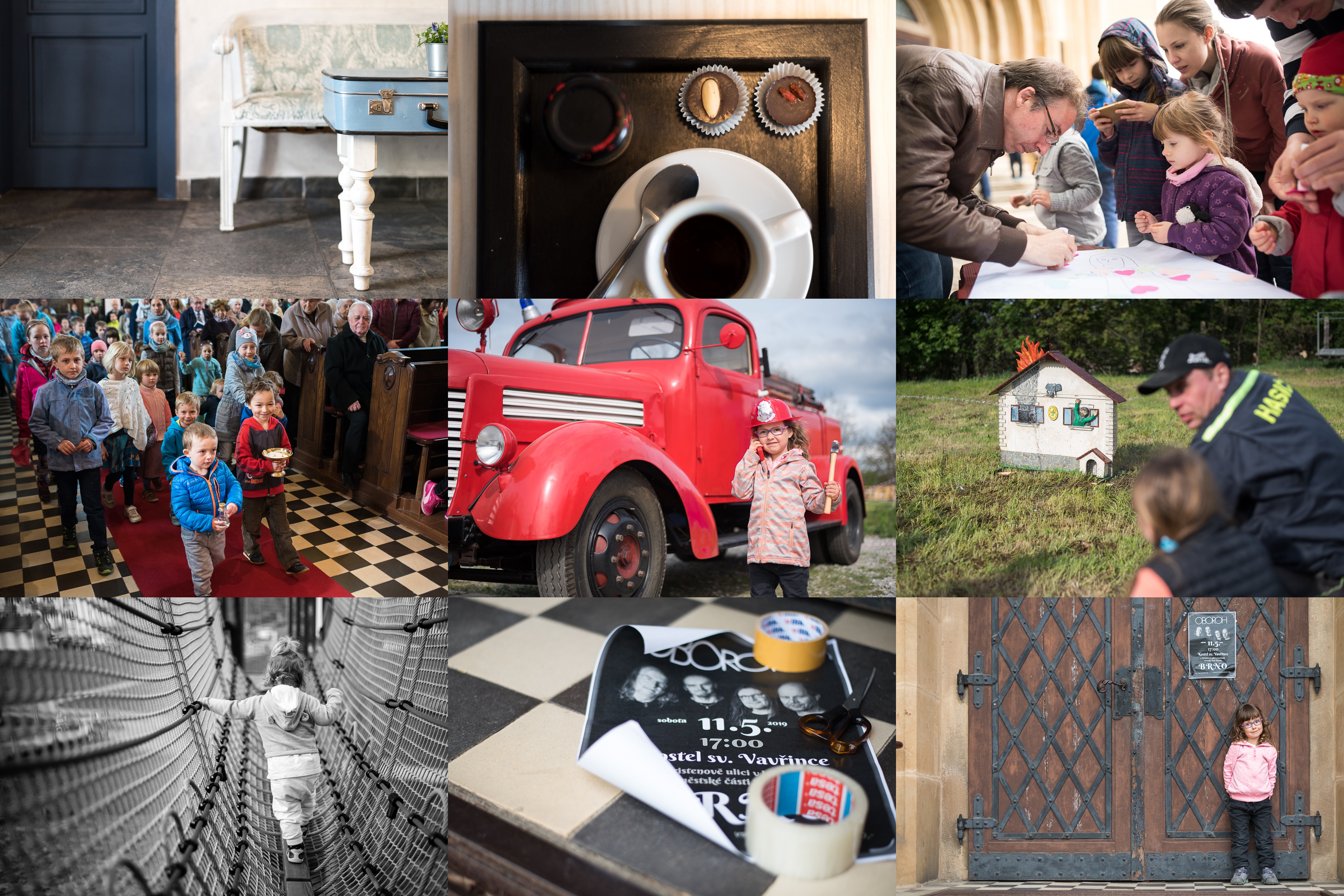 Ke kufru na nožičkách jsme si zatím sednout netroufli, co kdyby si ho najednou chtěl někdo odnést?! / Během našeho pravidelného "rande" na kurzu párového doprovázení si dopřáváme jako za mlada / S lepením srdíček odborně pomáhají tatínci / Že se Vítek pokaždé při nesení darů směje? Nebude to náhodou tím, že před oltářem stojí jeho taťka jáhen? :-) / Hoří? Kde? Jedu!!! / Velmi interaktivní trenažér hasení rodinného domku, profík dohlíží na správnou techniku - nás například musel jemně upozornit, že si stojíme na hadici :-) / Prolézačka vloni postavená z participativního rozpočtu stále stojí! / Lepit plakát na okované dveře kostela opravdu není žádný med / Černý výlep černých plakátů? O tom já nic nevím...