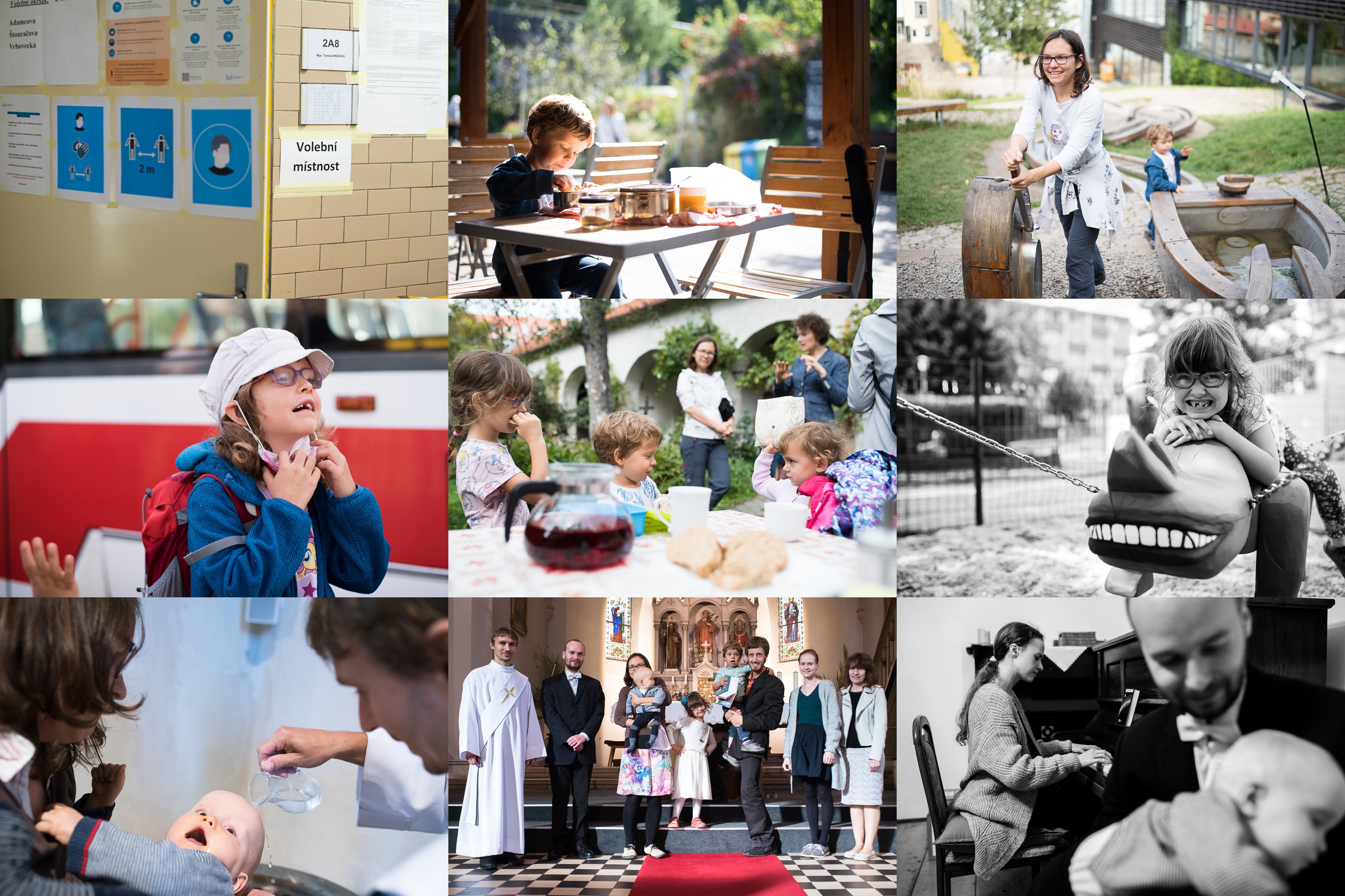 Žádné davy u voleb nebyly , s rozestupy nebyl problém :-) / Piknikujeme na verandě zavřeného bistra v Otevřené zahradě / Mami zaber, nějak Ti to nepřibývá / Verunka si strhává roušku po návratu ze svého prvního výletu s kroužkem Vrabčata / S Olinkou si nezahrávej, Raďas! / Nosorožec na hřišti u Komínské radnice má čerstvě opravené zuby, Verunka je ale na svůj úsměv náležitě pyšná / Viki se konečně dočkal / Křtiny jsme udělali v komorní sestavě / Afterparty ve farním sále, bylo potřeba vytřídit nějaké knihy do farní knihovny