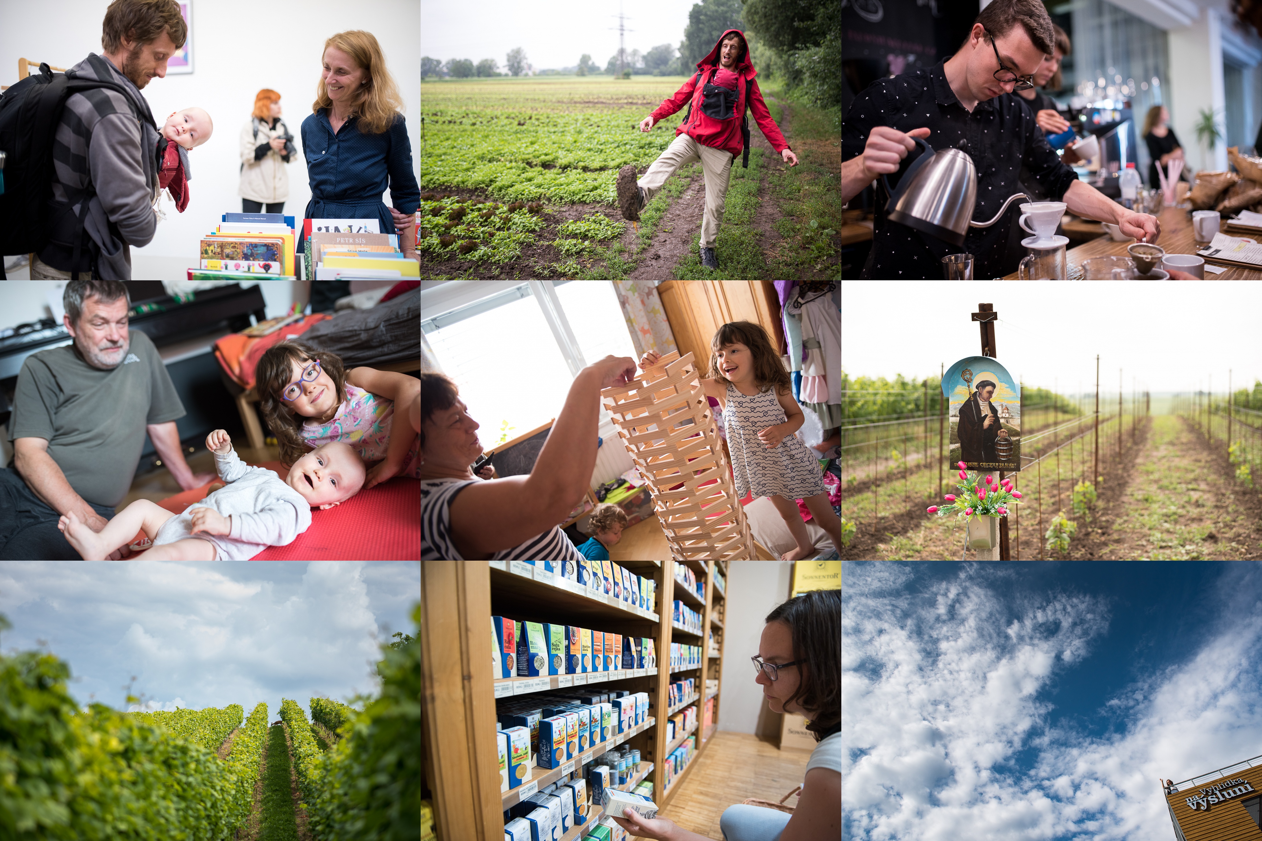 Viki na své první hipsterské akci, a hned v Industře! / Procházka kolem pole na farmě Ráječek těsně po dešti byla hipsterská poněkud méně / Ale i zabláceným botám navzdory jsme se stavili na jednu filtrovanou kávu / Hlídat Vikiho, toje práce pro dva / A stavět věž skoro až do stropu je práce pro dvě / Procházka mezi vinicemi u Čejkovic / Hned bychom jeli na vinobraní! / Nepřeberno lákadel v Sonnentoru / A po úspěčném výběru jeden vysluněný výhled