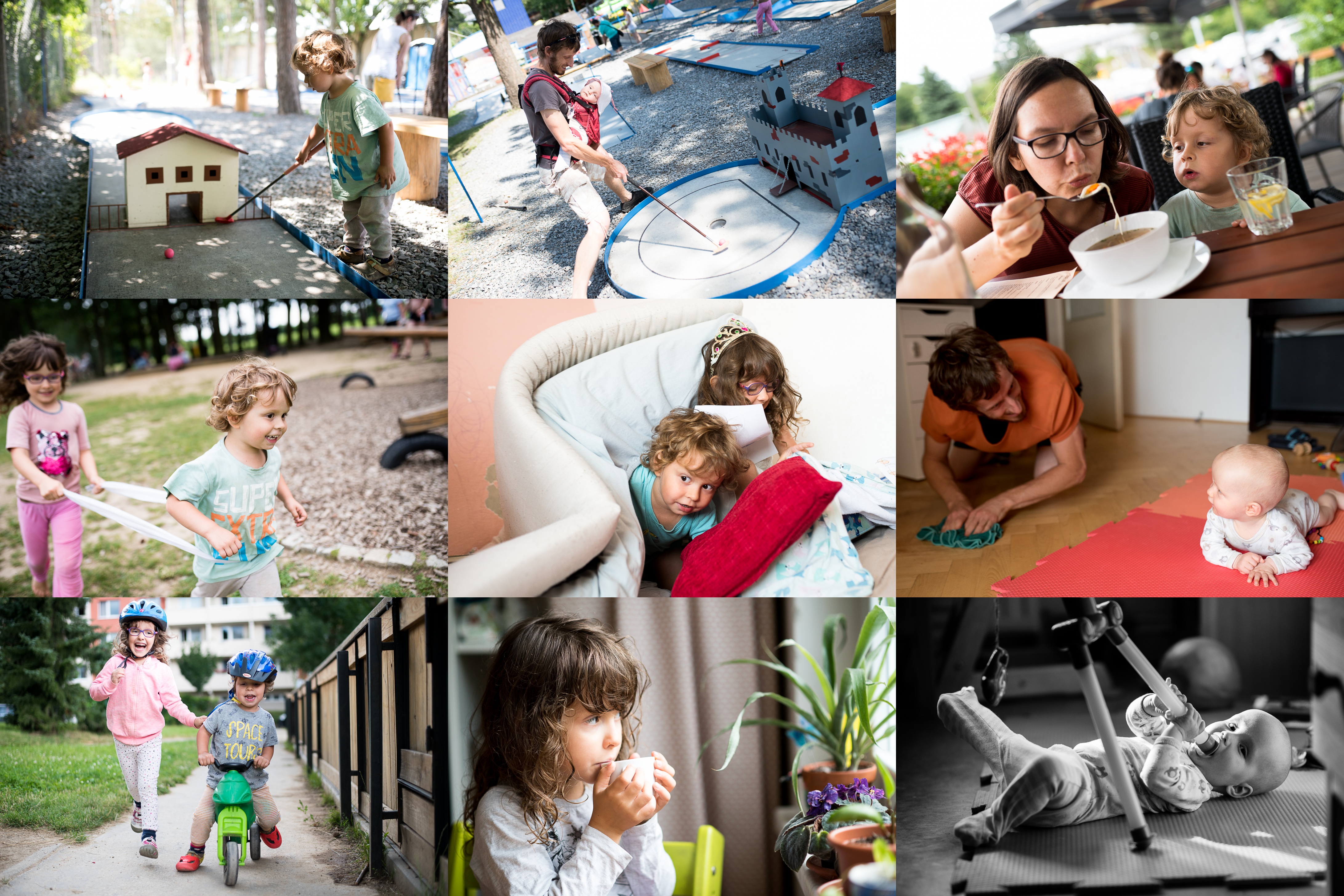 Radovánek sice vypadá jako minigolfový profík, ale ve skutečnosti si mnohem více užíval na místním pískovišti / Zato Viki dal do hry všechno / Vývar ve Vinglu prý Raďáskovi chutná (narozdíl od toho domácího) / Bělka a Hnělka - hyjé! / HLedáme poklad ukrytý v poli / Viki se učí nápodobou, příště už bude podlahu umývat sám / Bělka a Hnělka opět v akci(asi na 5 minut, poté přišel slejvák a oba koníčci, kočárek s Vikim i tatínek se jen tak tak stihli schovat pod klouzačku) / Zmoklým a zmrzlým dobrodruhům přijde šálek čaje k duhu / Viki a jeho kreativní využití hrazdičky