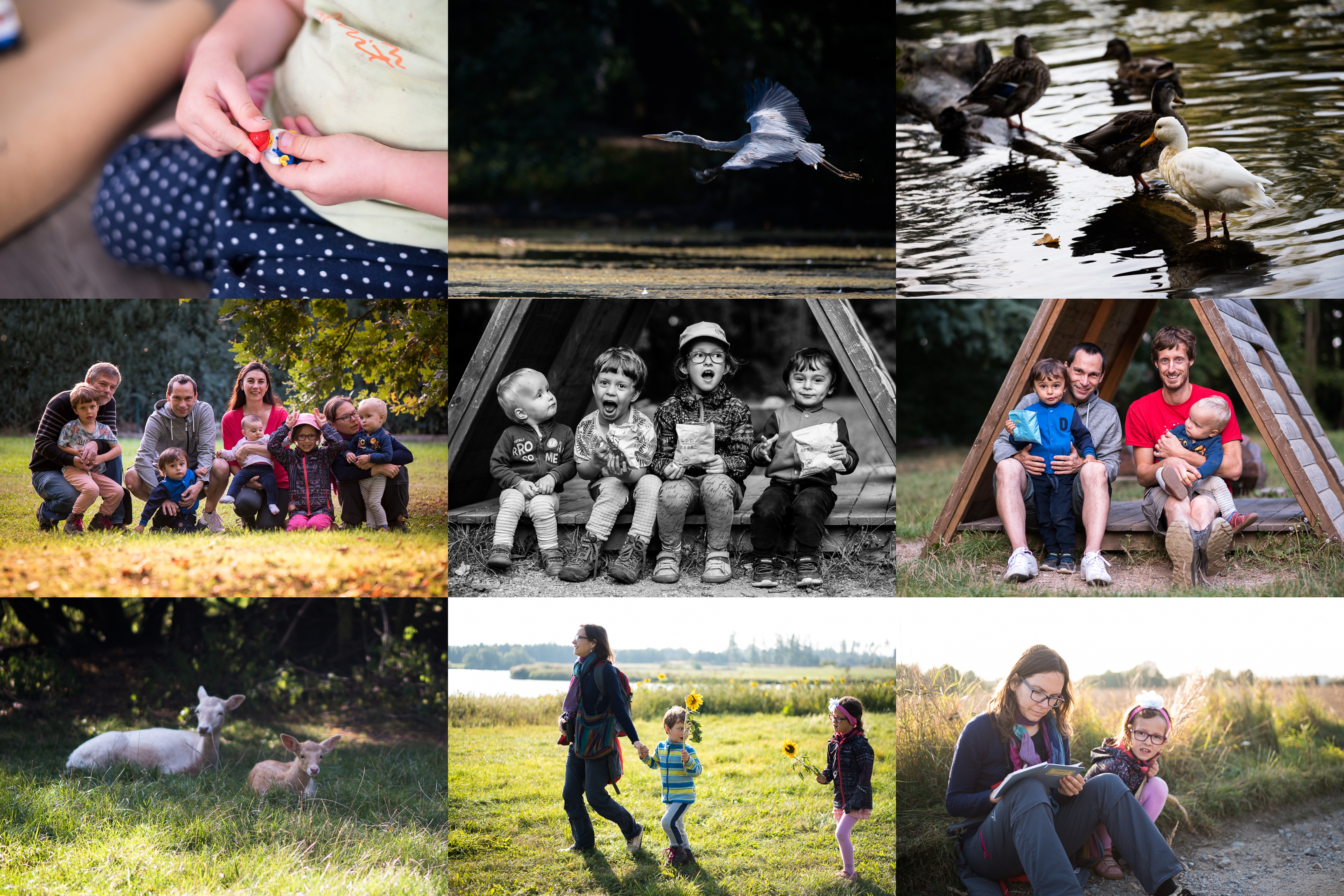 Vikiho motorika začíná být velice jemná / Startující Volavka, pár set metrů od paneláků, fakt! / Kachna divoká albín, asi nějaký mutant :-) / Rodinné foto, jak už to tak bývá, nemáme ani jednu fotku, kde by se koukali všichni do objektivu / Medvídková party / Švagrové v akci / Bílí daňci, pár desítek metrů od paneláků, fakt! / Konečně jsme udělali to, po čem jsme už dlouho toužili, sjeli jsme z D1 a vyběhli na ty krásné louky, které vždy pozorujeme z auta... / ...a pak všechny naše pocity zachytili ve verších