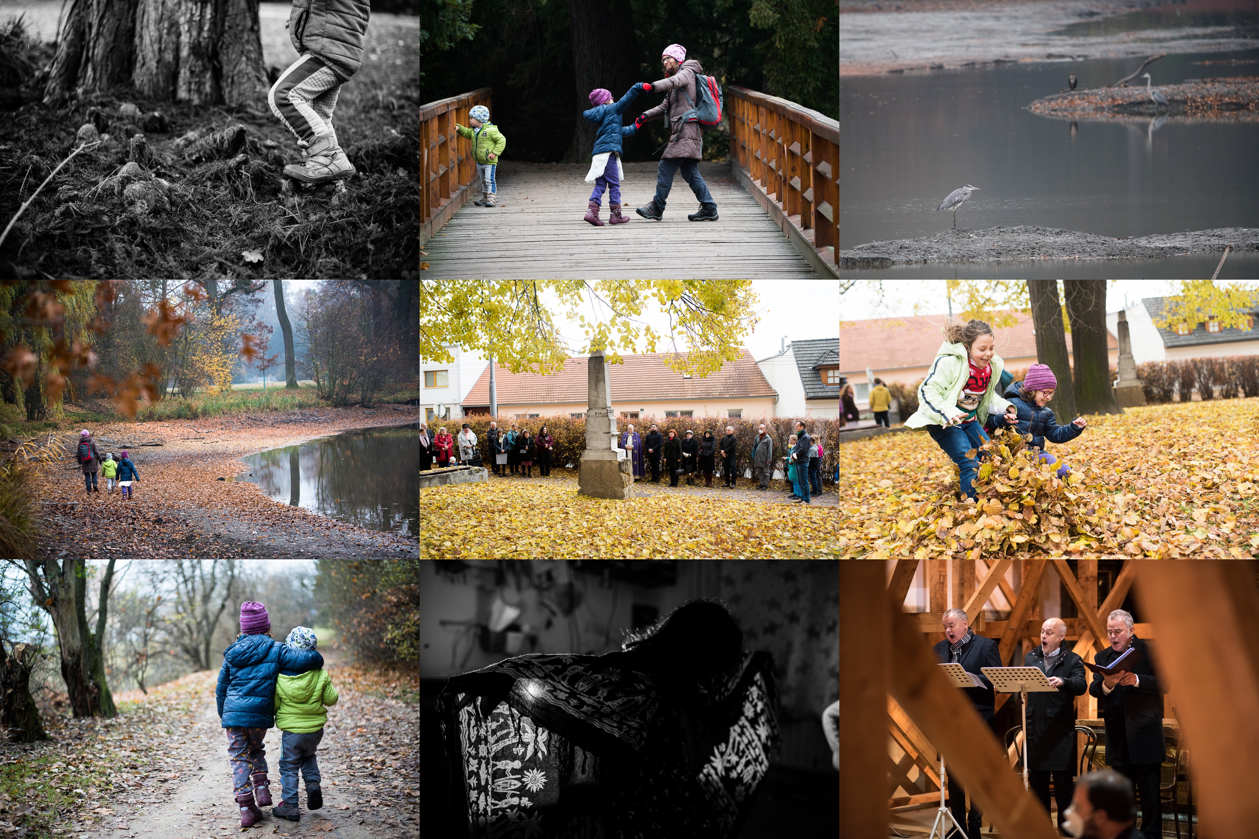 V lednickém parku mají takto strašidelné kořeny, naštěstí nebyly bludné / Ten můstek je fotogenický, zapózujte mi na něm, třeba tancujte / Měsíční krajina se dvěma volavkami a kormoránem / Procházka po břehu vypuštěného rybníka byla příjemná až do chvíle, kdy jsme se začali bořit / Modlitba u památníku padlých hrdinů / Bez skákání do hromady listí by podzim nebyl kompletní / Pojď, brácho, nevztekej se, budeme si spolu vyprávět nějakou pohádku / Tato diskotéka byla skutečně strašidelná / Tom si zafotil v kostele sv. Máří Magdaleny