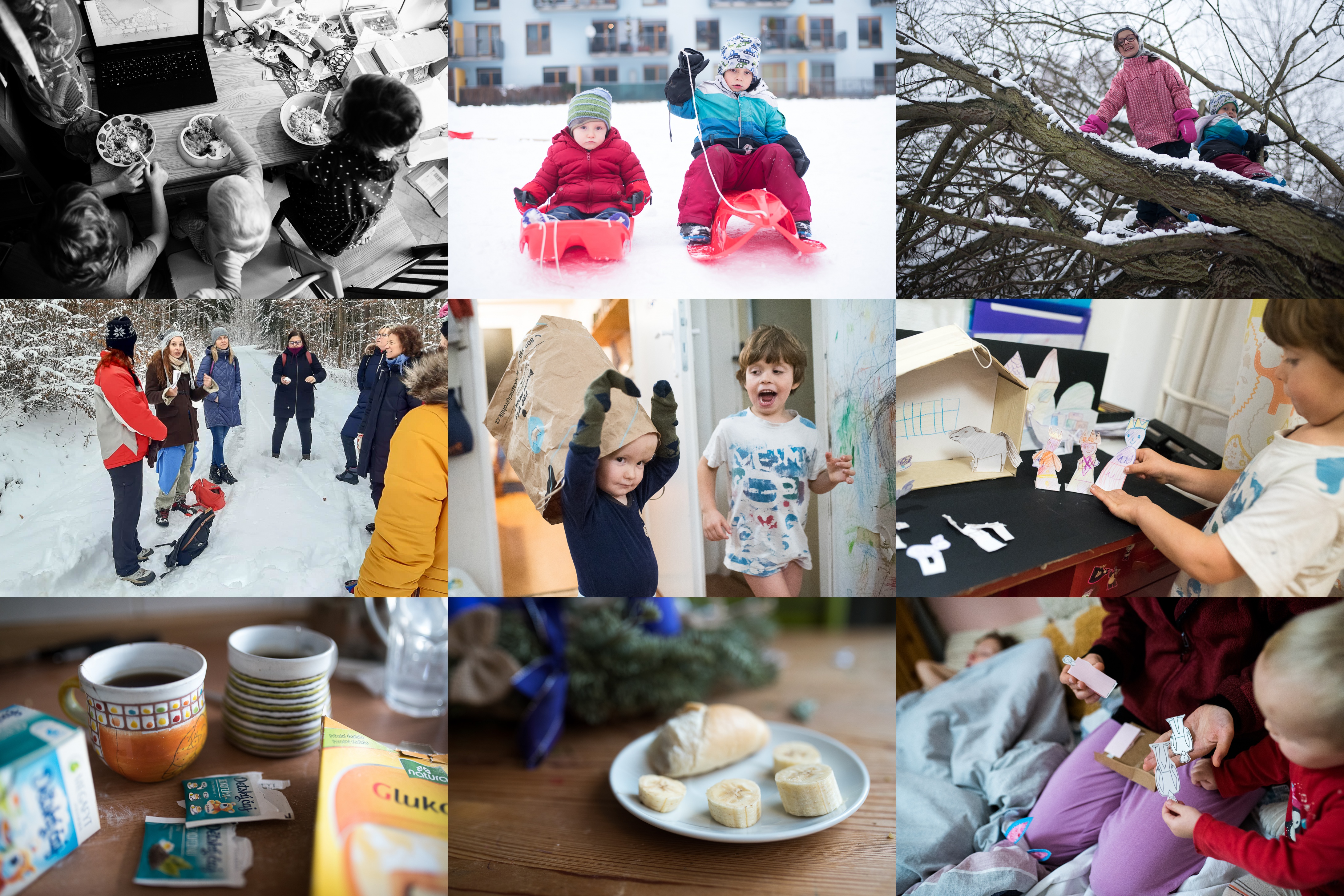 Ano, přiznáváme, že některá jídla se u nás konzumují u pohádky / Na sněhu! / Rozlomený strom u našeho hřiště vytvořil nové prolézací příležitosti / Pouť žen do Křtin byla pohádkově zimní / Viki v přestrojení za příšeru: uááááá! / Náš papírový betlém se postupně zalidňuje, i tři králové se přišli poklonit / Na žaludeční virózu jsme vybaveni tekutinami... / i potravinami / Co zbylo z nedělní katecheze