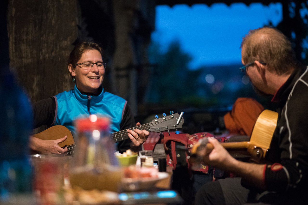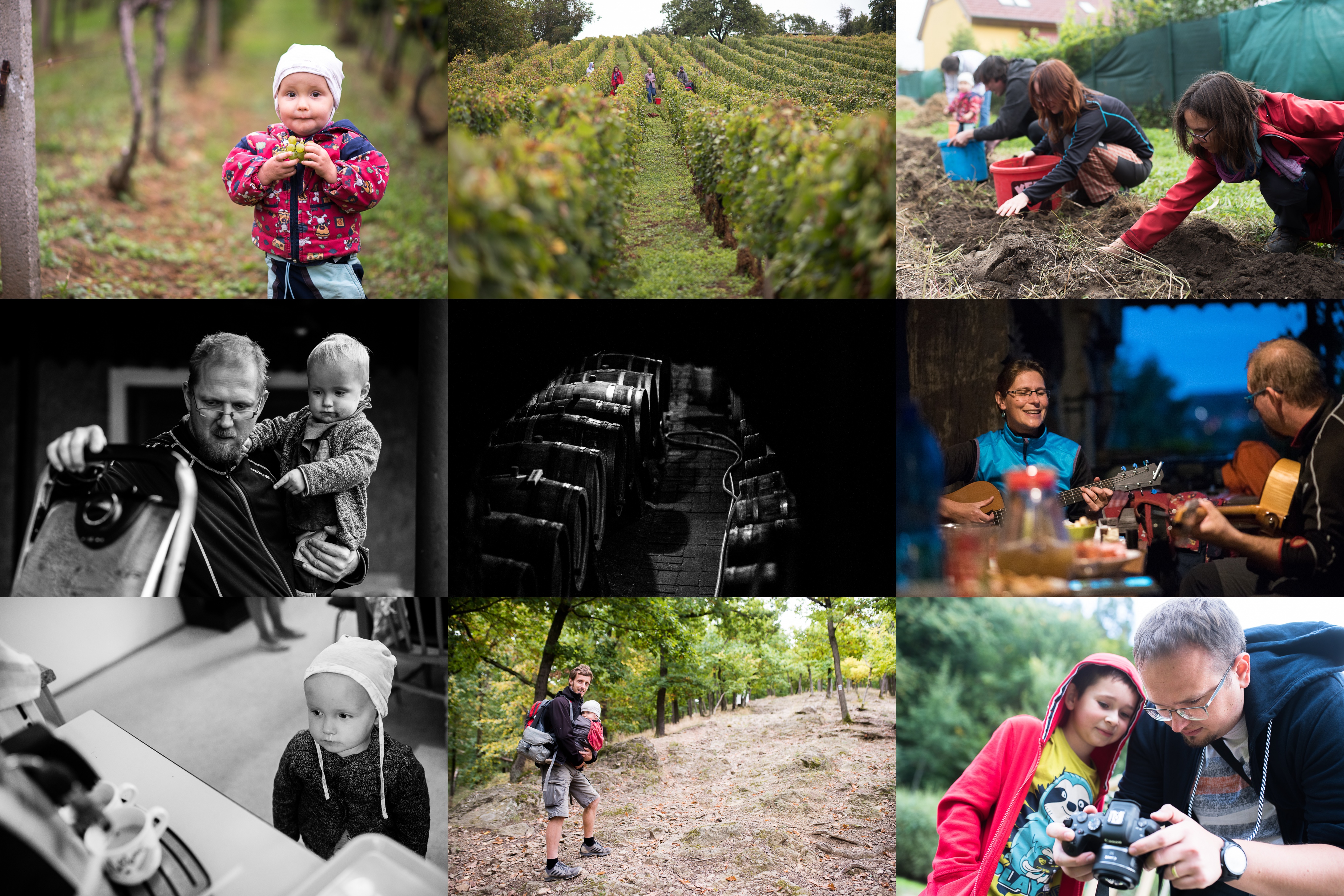 Zodpovědný pracovník na vinobraní musí ochutnat, jestli je víno dostatečně sladké / V řádcích / A že vína dozrálo málo, plynule jsme se přesunuli k bramborám / Kontrola grilu / Vinná geometrie / A zpívalo se a hrálo / Dvě malá espressa, expres, prosím / Stoupáme chudčickou křížovou cestou / Peťa testoval bezzrcadlovku a my jsme u toho nemohli chybět