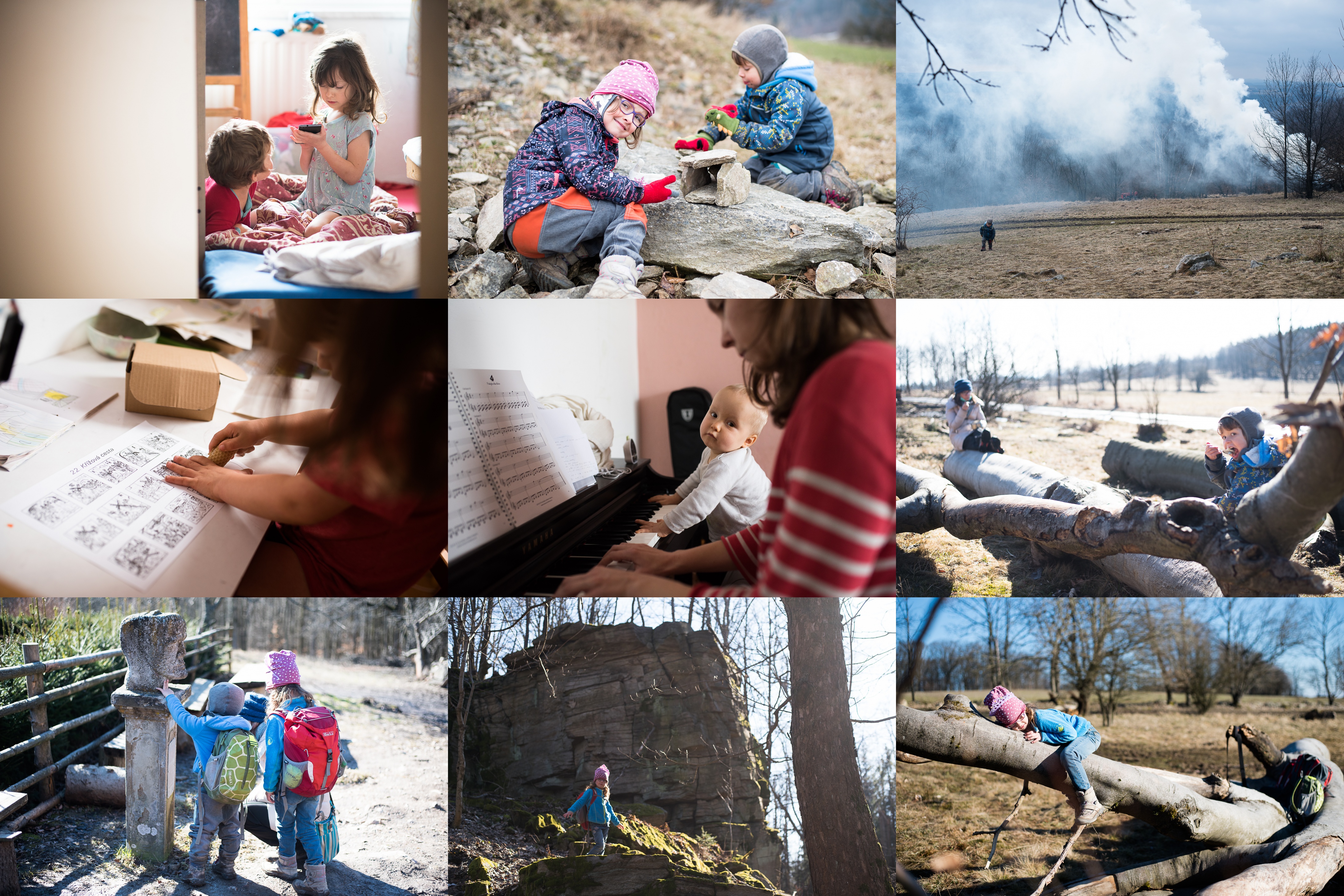 Ranní sourozenecká idylka s mobilem v ruce / Stavba kamenných domečků a hnízd na Veselském Chlumu byla podobně idylická / Takový krásný výhled jsme měli (a pak začali pálit křoví) / Zkoušíme, co se stane, když nakreslíme křížek svíčkou a pak přemalujeme vodovkou / Na klavír už hrajeme jedině čtyřručně / Tyto duby se staly místem občerstevení, tělocvičnou, meditační místností i ložnicí / Ocitli jsme se v pohlaví Járy Cimrmana / Díky Verunčině skautské výzvě objevujeme místa netušená - například vrch Sýkoř s mrazovými sruby / Takhle nějak spávají lenochodi
