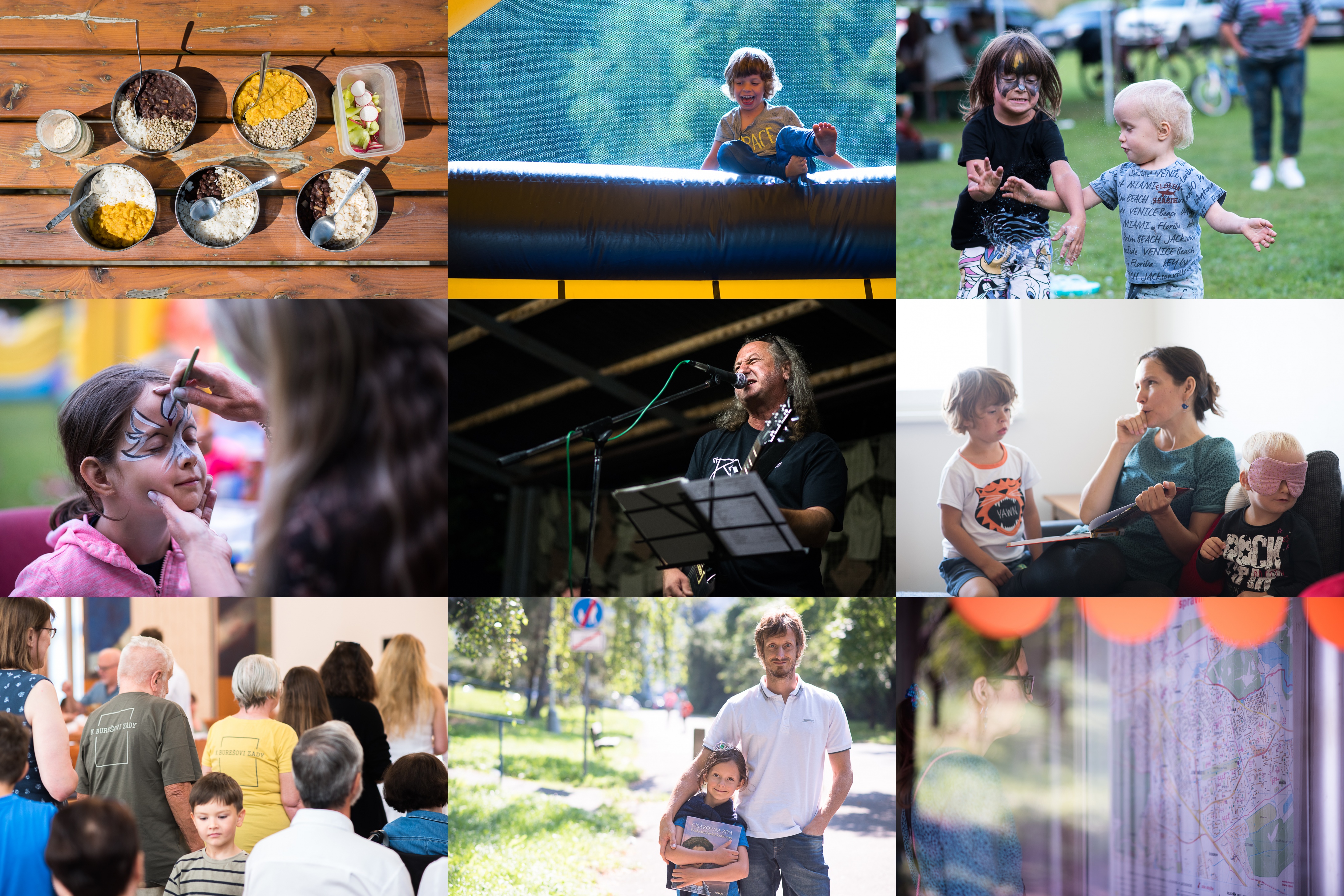 Oběd (cestovní verze) / Skákací hrad zabaví děti na celé odpoledne / Bubliny jdou taky na dračku / A na malování na obličej jsou ochotní stát hodinové fronty / Zkrátka víc takových oslav... večer navíc nastoupili na pódium tihle rockeři / Kdybyste si náhodou nevšimli: Vikoušek tu není / Ve frontě na svaté přijímání / Cestou z modro-bílé nedělní mše v Komunitním centru Matky Terezy / A kde že jsme to vlastně chodili?