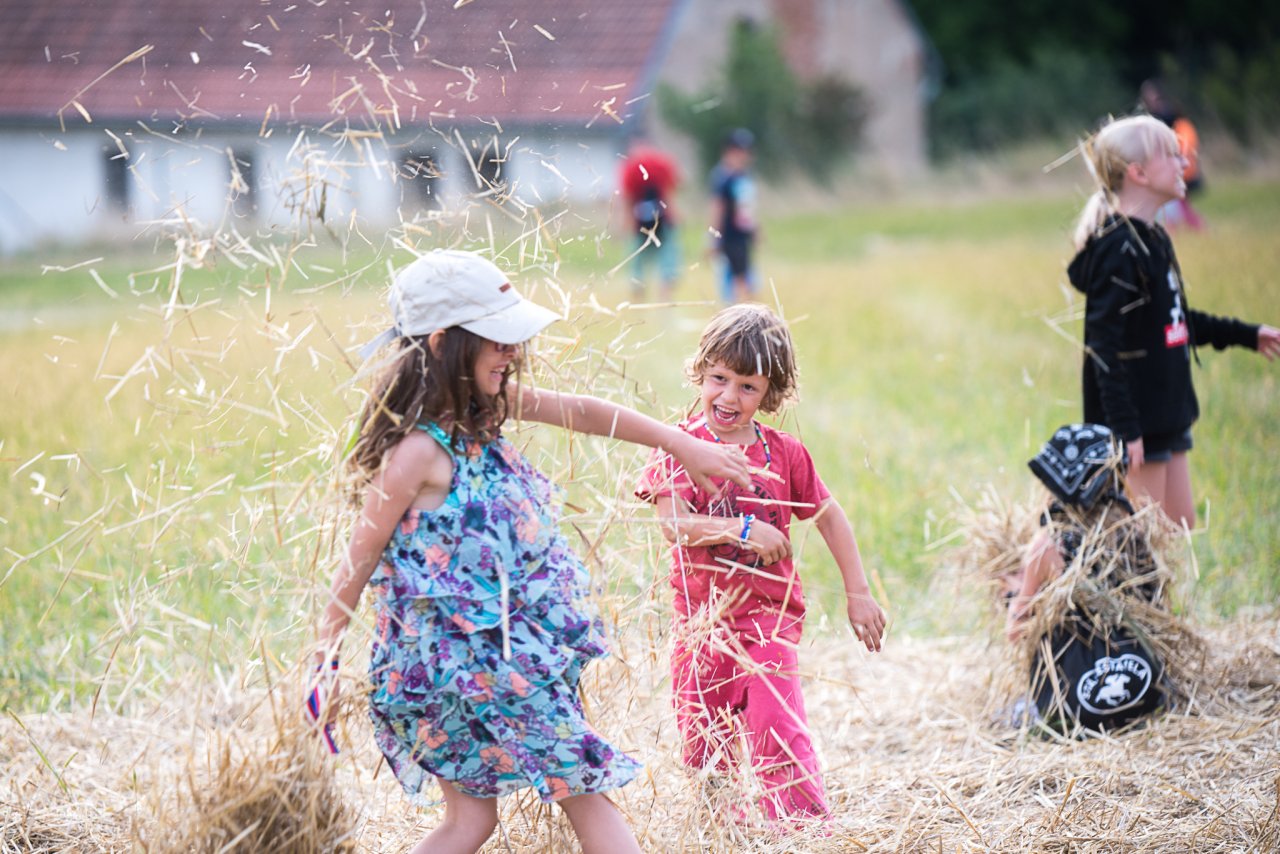 Po cyklotáboře projede už Véra na prvním úseku pump tracku jezdí jako profík / Naše oblíbená akce! / Dospělí doprovází své děti na dětská divadélka, ale nakonec se sami baví možná ještě víc / Stéblový šerm do rytmu kapely Kumbalu / A na závěr pořádná slámová bitva / Další oblíbenou akci - komínské hody - jsme letos okusili jen na mši svaté / Zato jsme pak cestou do Litoměřic obdivovali McBudky / Otevřít krabici s plastovými zvířátky, to je skoro jako objevit poklad / 12 (let manželé)