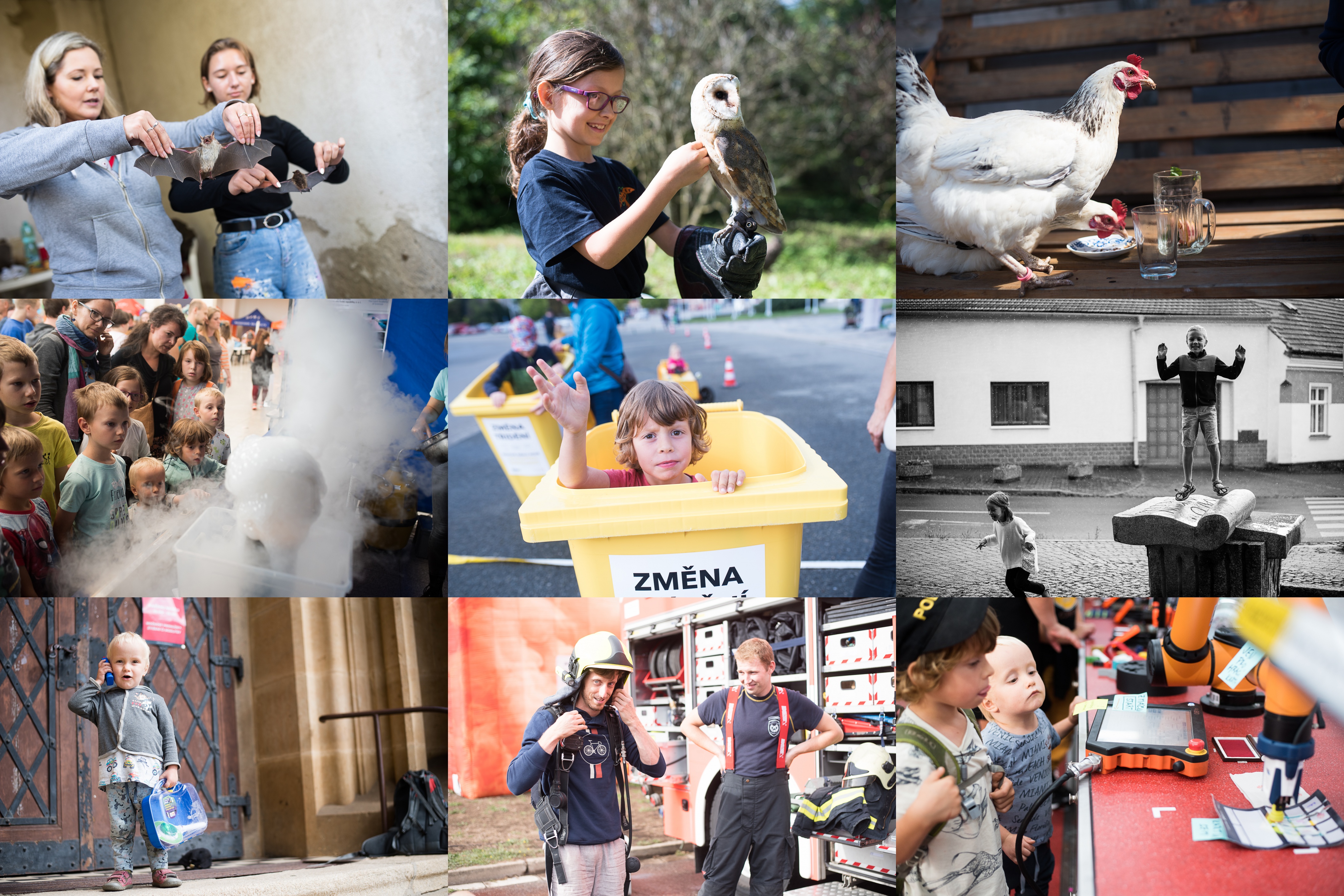 Na některé udělali při návštěvě Záchranné stanice divoké zvěře v Jinačovicích největší dojem netopýři / a na jiné možnost pohladit si morčátka, nebo sovu pálenou / Café Statek / Fascinovaně pozorujeme "Hrnečku, vař!" s tekutým dusíkem / Změna třídění / V neděli bylo počasí obzvláště nevyzpytatelné / Příslušník dopravní policie dohlíží na plynulost provozu před kostelem / Jaké to je, být na chvíli hasičem? / Kluky nejvíc fascinovalo razítkovací rameno