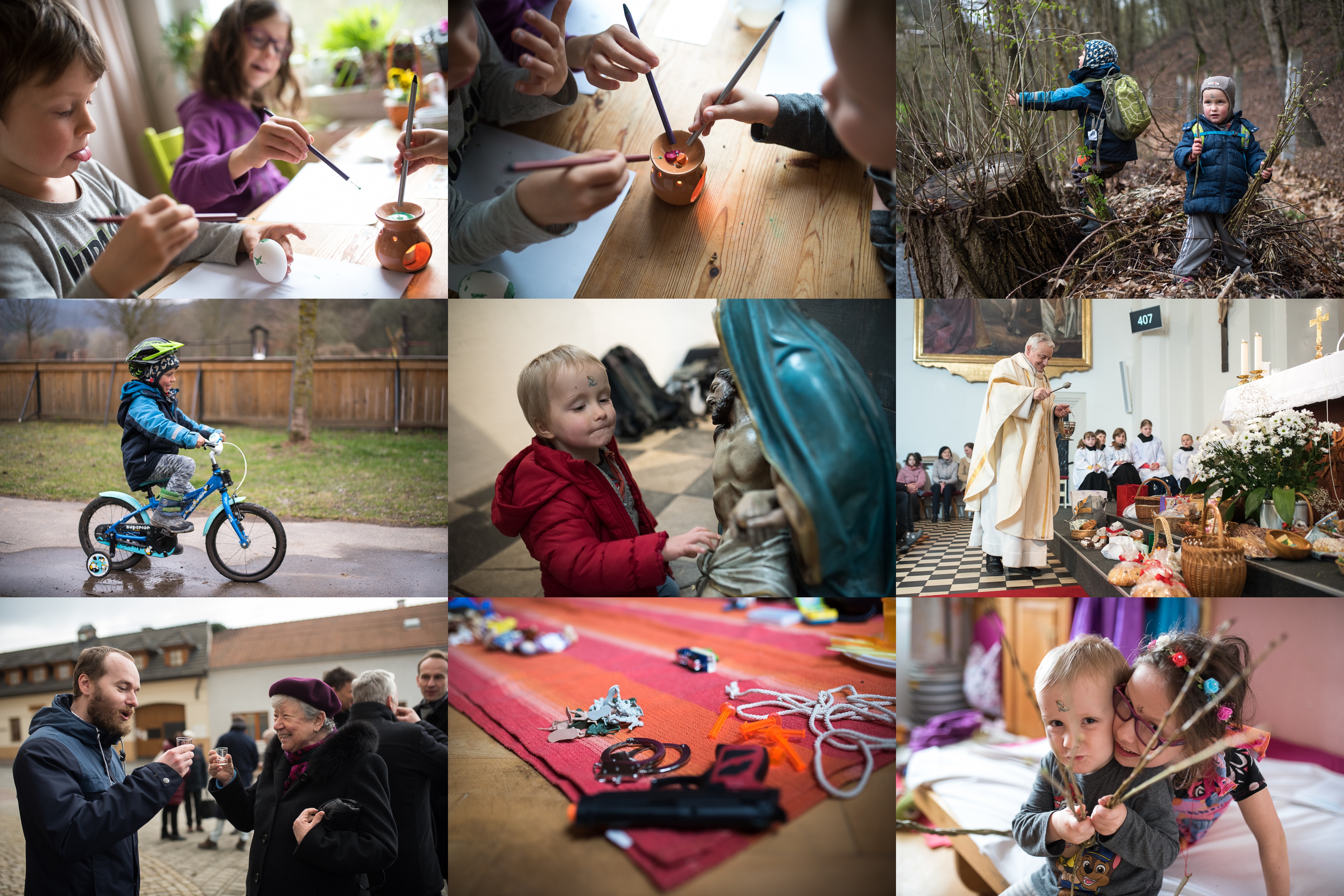 Ráďa mrkl na YouTube na tutoriál a malování kraslic mohlo začít / Některé věci se vyplatí nevyhodit hned, naše milá maminko minimalistko! (třeba starou aromalampu a rozlámané voskovky) / Pánové vyrazili na proutky / Ráďa se loučí se starým kolem / Za oltářem s Pietou / Marcel se rozplývá nad velikonočními pokrmy / Agapé před kostelem / Na herní půlhodinku vše připraveno / A jde se plést!