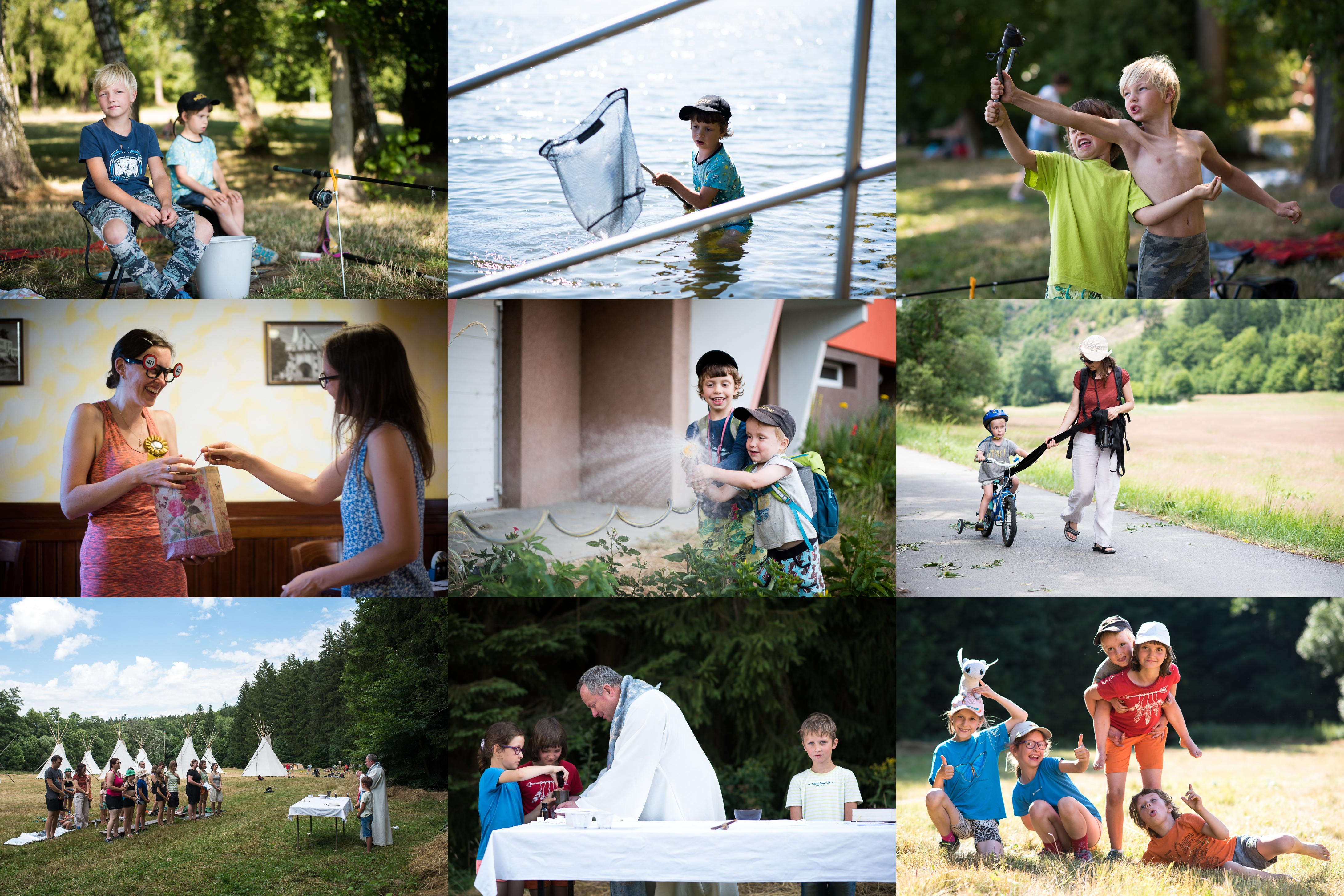 Ráďa si vyzkoušel, jaké to je trpělivě sedět a čekat, až zabere / Zdá se, že zatím ho více lákají akčnější činnosti, jako třeba tahle / Nebo tahle / Se čtyřicátinami se letos roztrhl pytel / Zahrádak si zaslouží svou denní porci vody / Jedeme na tábořiště pod Vlčí skálou / Mše svatá pod širým nebem / Ministranti / Nemohli by tu zůstat rovnou všichni?