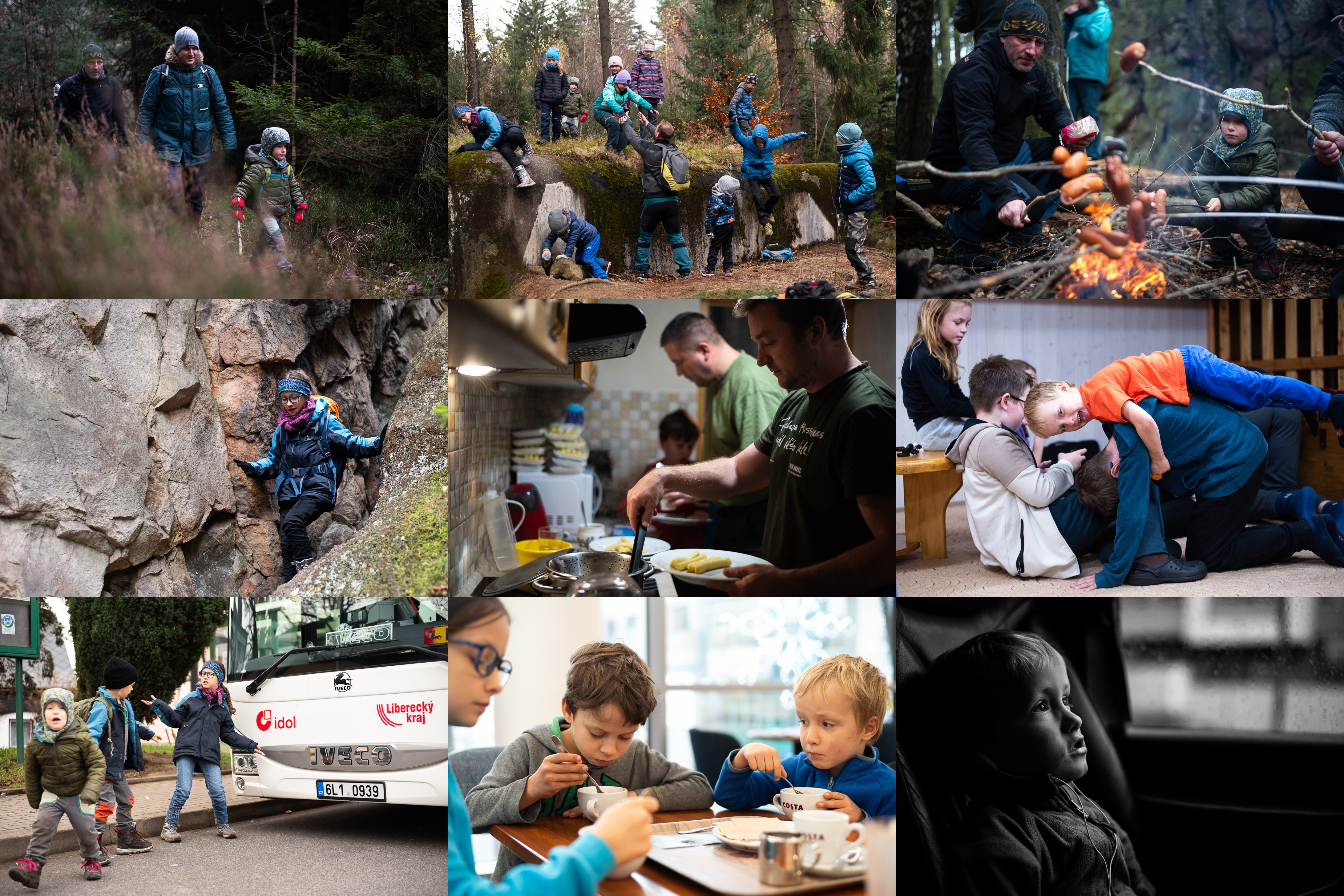 Začíná víkend se starou skautskou partou, kde se tatínkovi říká "Tarzoši" - Viky se ujal role horského vůdce / Tááák, a na 3-2-1 teď všichni skočíte dolů, jo? / Pod tou skálou, kde špek z buřtů syčí / Verča vždy elegantní i v technicky náročných pasážích / Citát z rodinné kroniky - "Točili jsme chlapům celý večer pivo a oni nám pak za to uvařili šišky s mákem" / Vikymu stačí pár minut, aby si našel někoho, po kom může vesele skákat / Tak tenhle autobus je prostě náš idol! / Čekání na žlutý autobus v Liberci - neboj Viky, horké čokolády máš stejně jako ostatní / Audivizuální systém ve žlutém je trochu ruleta, ale Vikymu sluchátka fungovala vždy