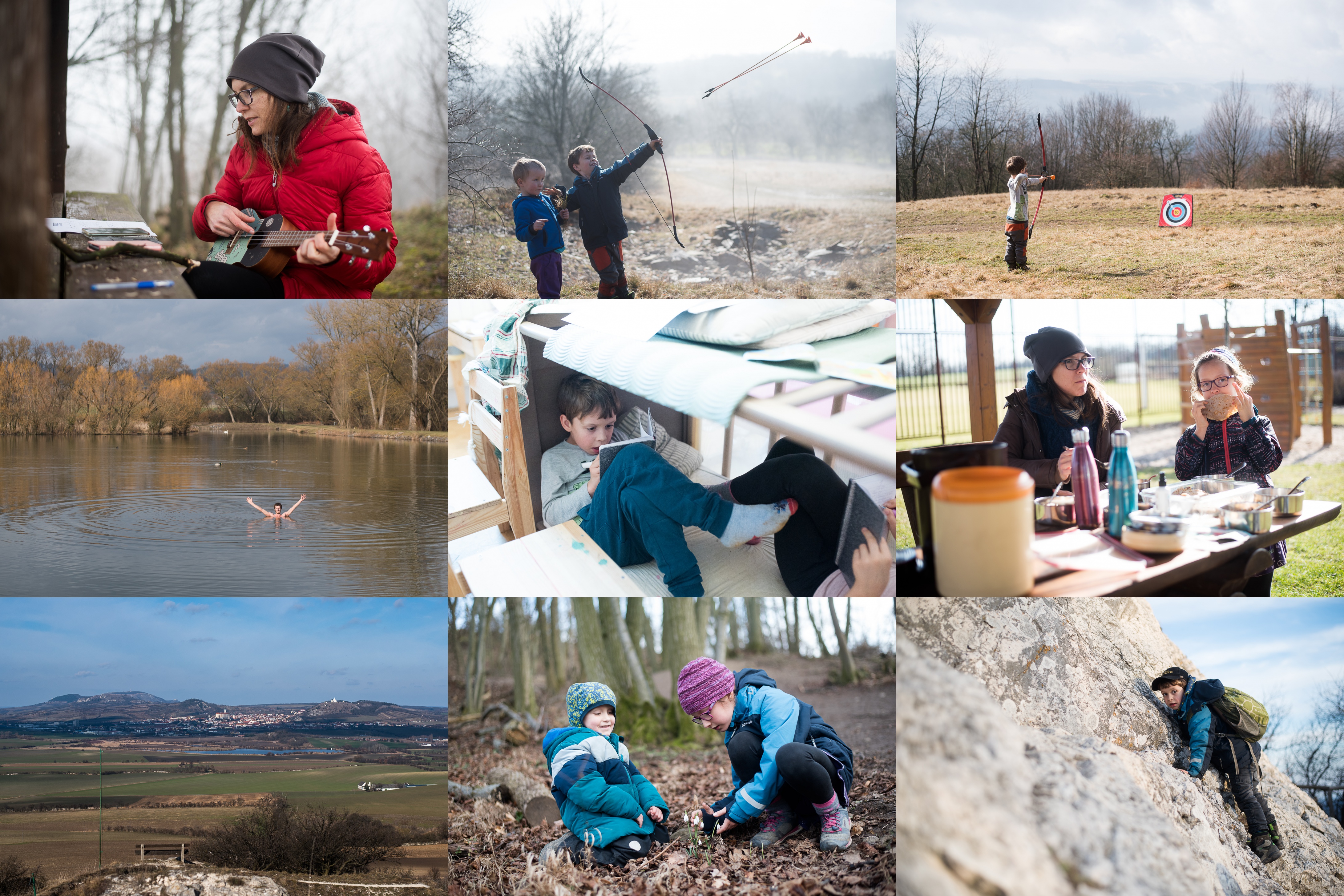 Ukulele má jednu velkou výhodu - dá se nosit všude s sebou / Jestli se dají vystřelit dva šípy najednou? / Trénujeme přesnu mušku na našem oblíbeném místě / Zkoušíme, jestli je rybník Srpek vhodný k otužovacím účelům - celkem ano, ale Svratka v Jundrově je Svratka v Jundrově :) / V improvizované kanceláři vznikají první kapitoly nových knih / Náš první letošní venkovní obídek / Takhle krásně vypadá Pálava z rakouské strany / Stopujeme jaro / Dívčí hrady