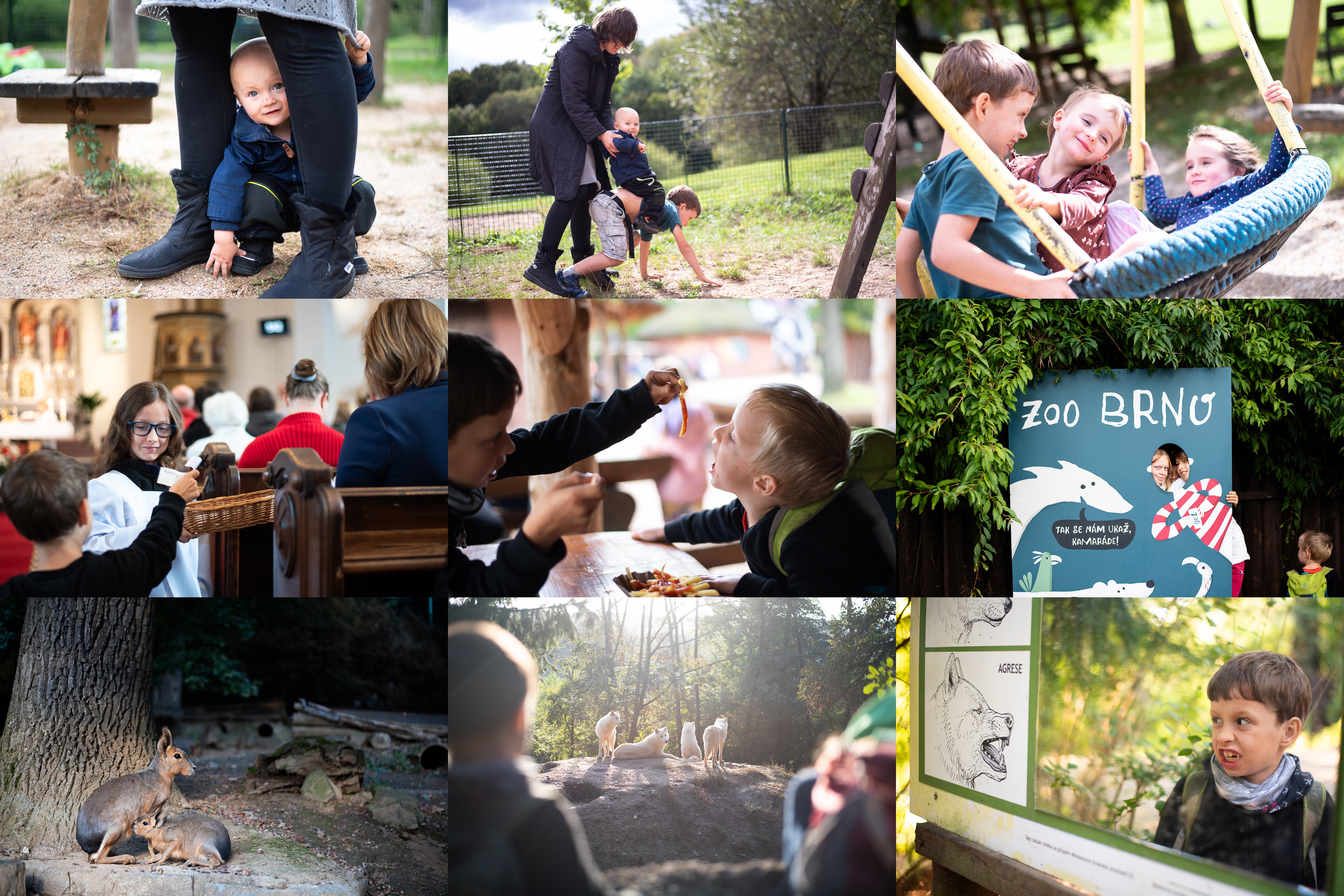 Víteček zpočátku pózoval z bezpečí pod máminou sukní / Ale postupem času si troufl i na jízdu na Radovánčím hřbětě / Zdá se, že Ráďovo houpání holčičky opravdu potěšilo / Vlastní sestře odevzdává Ráďa peníze kupodivu tak nějak ochotněji / Krmení Vikoušků ve 13.30 v občerstvení u žiraf / Jak se tam máme všichni vejít, to teda fakt netušíme / Mařátko. Nebo maře? / To je ta smečka, která některé dny vyje na celou Bystrc / Který výraz se Ti, Ráďo, bude napodobovat nejsnadněji?