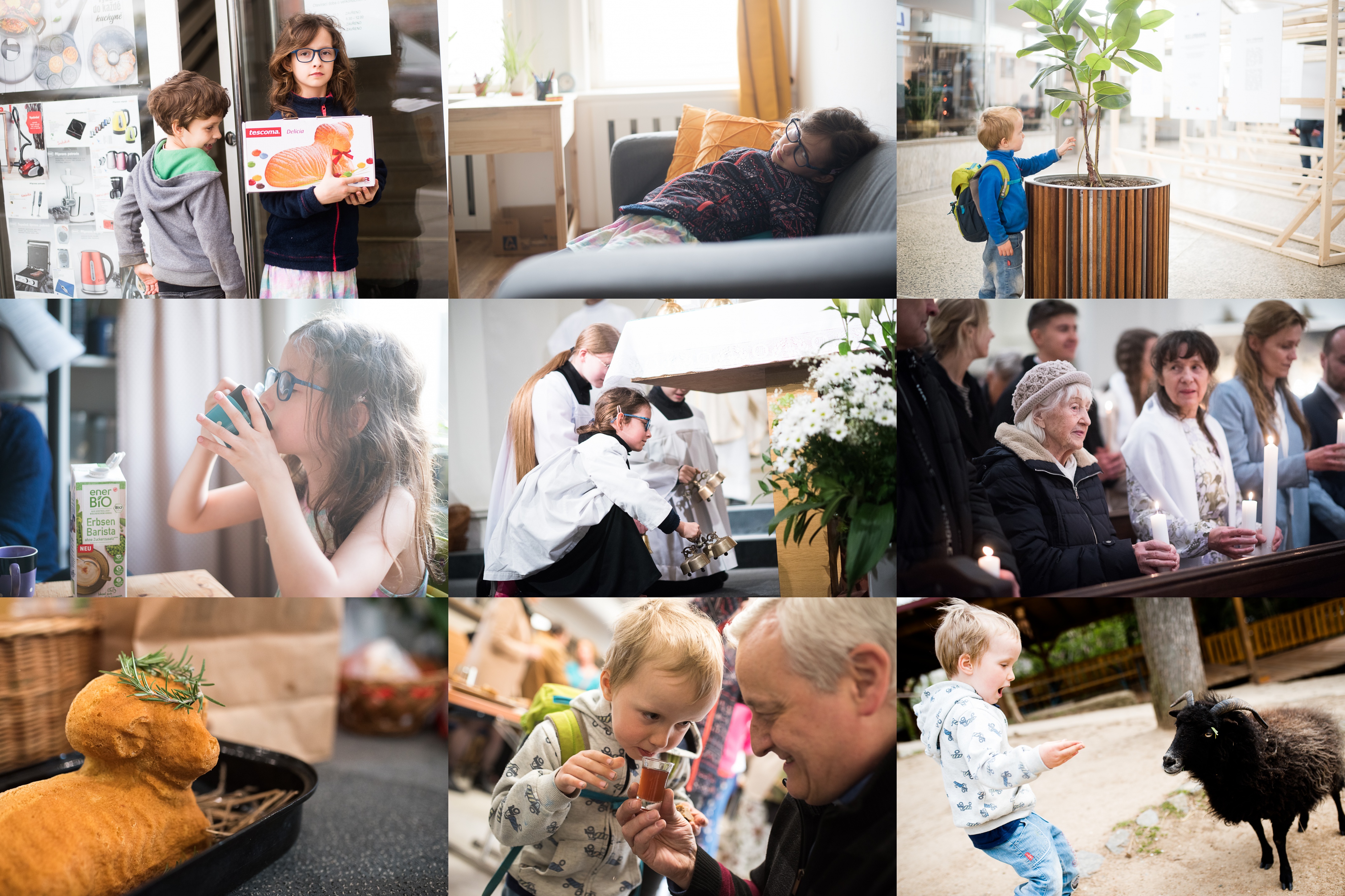Někomu by se mohlo zdát, že kupovat formu na beránka na Bílou sobotu je trochu pozdě... ale my jsme to stihli / Tak jakpak by to asi mami vypadalo, kdybys dělala klasickou psychoanalýzu? / Není zeleň jako zeleň / Naše oblíbené hráškové mléko, mňam / Zvony se vrátily z Říma a Verča byla u toho / Křest / Ne, tohle není náš beránek. Ten náš byl sice dobrý, ale bohužel bez hlavičky / Co ho to učíte, pane faráři?! / Co si asi povídají?