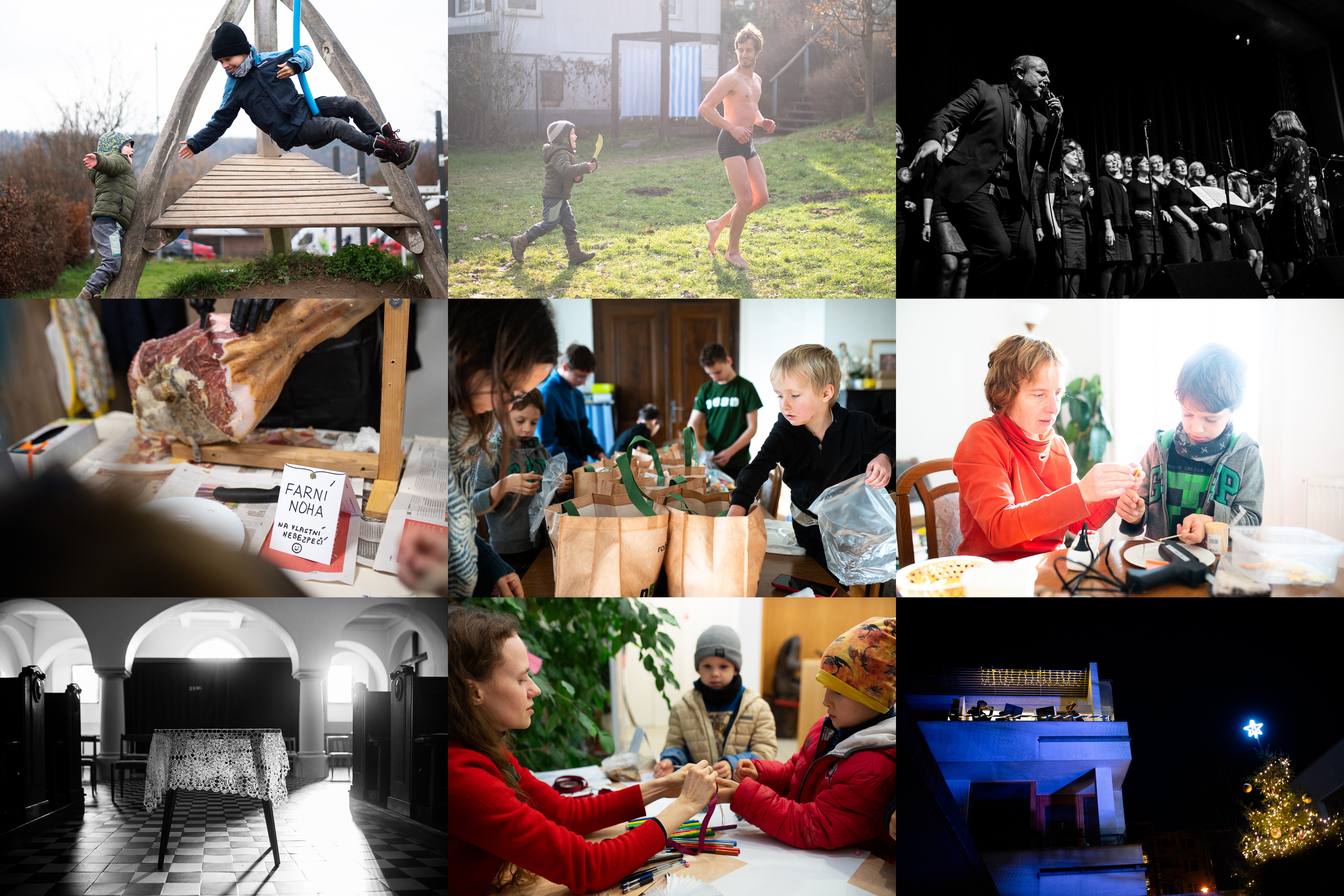 High five / Hele, čerstvý maso, a rovnou i zmražený! / Tom s Vikym fotí Brno Gospel Choir, zatímco Lenka s Ráďou jsou na představení "Hurvínek prodává nevěstu" / V rámci adventního jarmarku došlo i na první ochutnávku farní nohy - měla velký úspěch! / Tradiční předmikulášská manufaktura je u našich dětí velmi oblíbená / Letos se zároveň lepily i hvězdičky na špejličky / To se hned pozná, když kostel hlídá fotograf - on tam jen tak nesedí a nečeká na návštěvníky, ale hledá si "places of atmosphere" / Adventní tvoření na radnici mělo letos zástupce z naší farnosti / A k rozsvěcení stromečku zněl žesťový doprovod