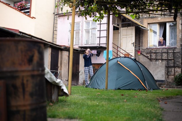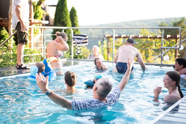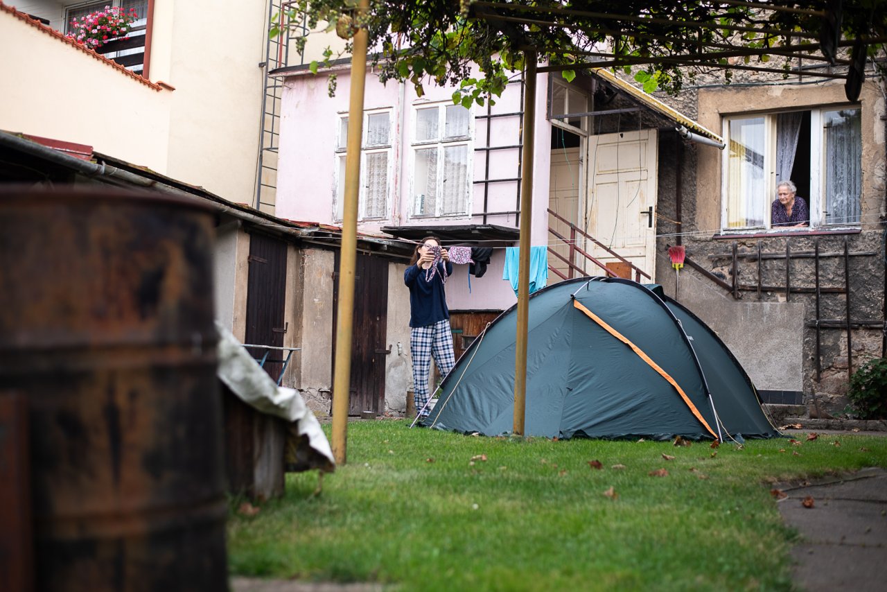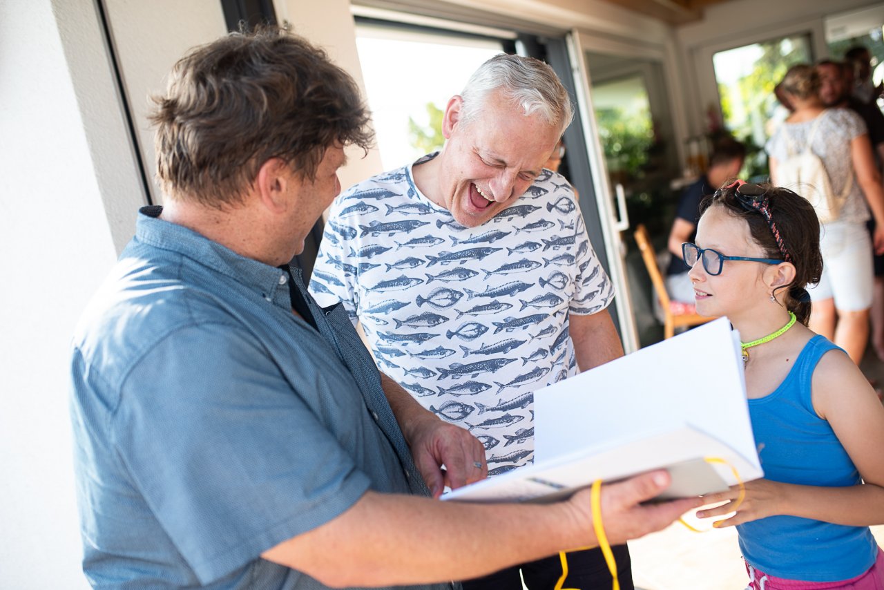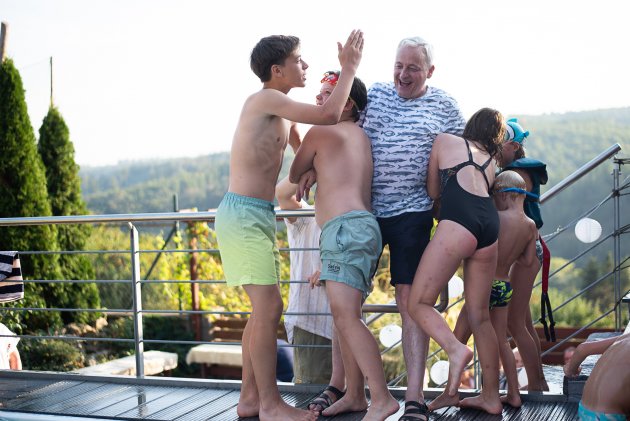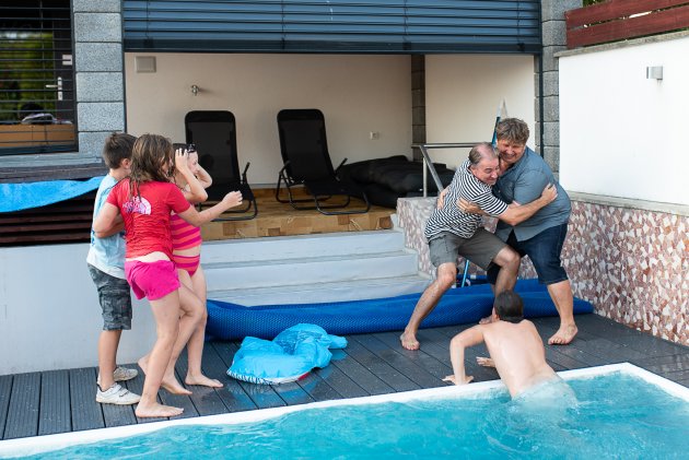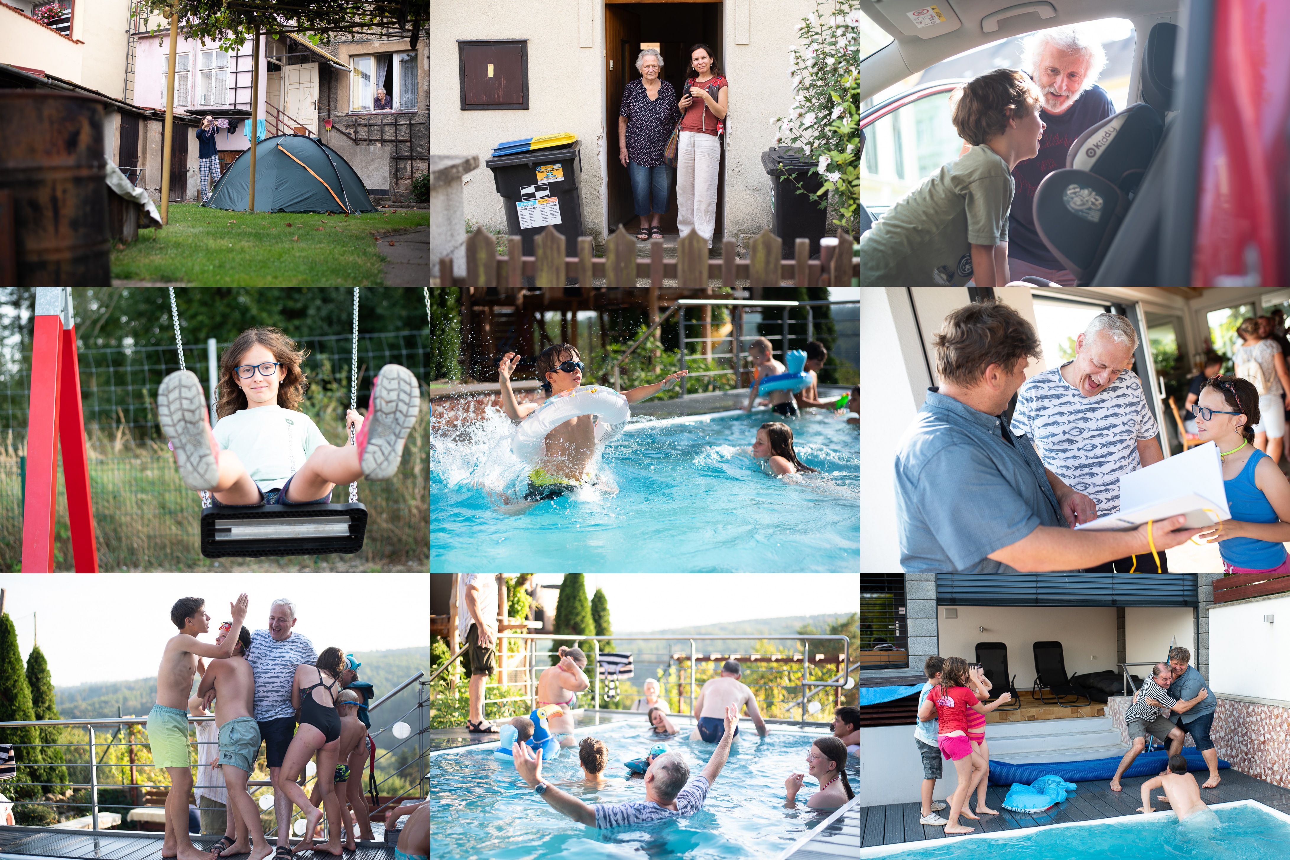 Dobré ráno! Jestlipak nám přes noc uschlo prádlo? / Tak my zase někdy přijedeme! / Loučení s dědou a babičkou bylo obzvláště veselé / Zatímco si s Verčou užíváme portrétování u Devíti křížů, Vikiho právě na vedlejší houpačce bodá vosa do prstíku / Vhoďte děti do bazénu, a už je odtamtud nedostanete / Trochu jsme se obávali, jak Pavel naši lehce nekorektní fotoknihu přijme... zdá se, že dobrý / Kolik dětí je potřeba, aby dostaly do bazénu jednoho Marcela? / A je tam! / Tady už děti raději vyklidily pole a jen se dobře baví