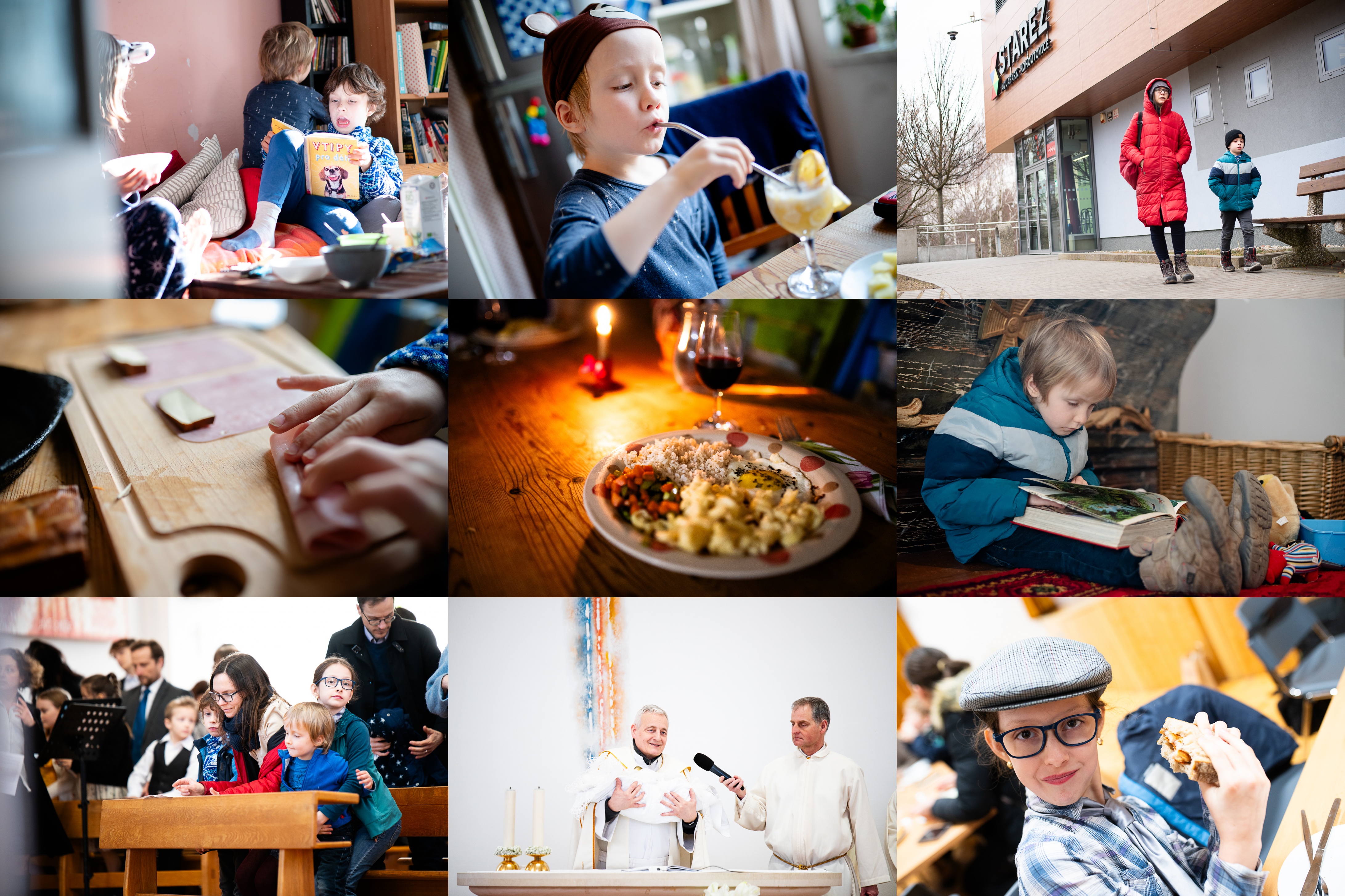 Verunčina návštěva u nás měla por ránu all inclusive: snídani i vtipy / Jeden drink pro pana medvěda / Po dlouhé době všichni dostatečně zdraví na to, abychom mohli vyrazit do bazénu / Zde vzniká Ráďova specialita: tofíčkové rolky se šunkou, následuje okořenění a osmažení na pánvi / Tahle večeře na nás doma čekala po návratu z výročního rande, děkujeme dětem a slečně hlídačce za krásné překvapení! / Plné zaujetí při mši svaté / Dostali jsme pozvání na křtiny / Matoušek během křtu disciplinovaně usnul / Řízek jedině v chlebu, jak jinak?