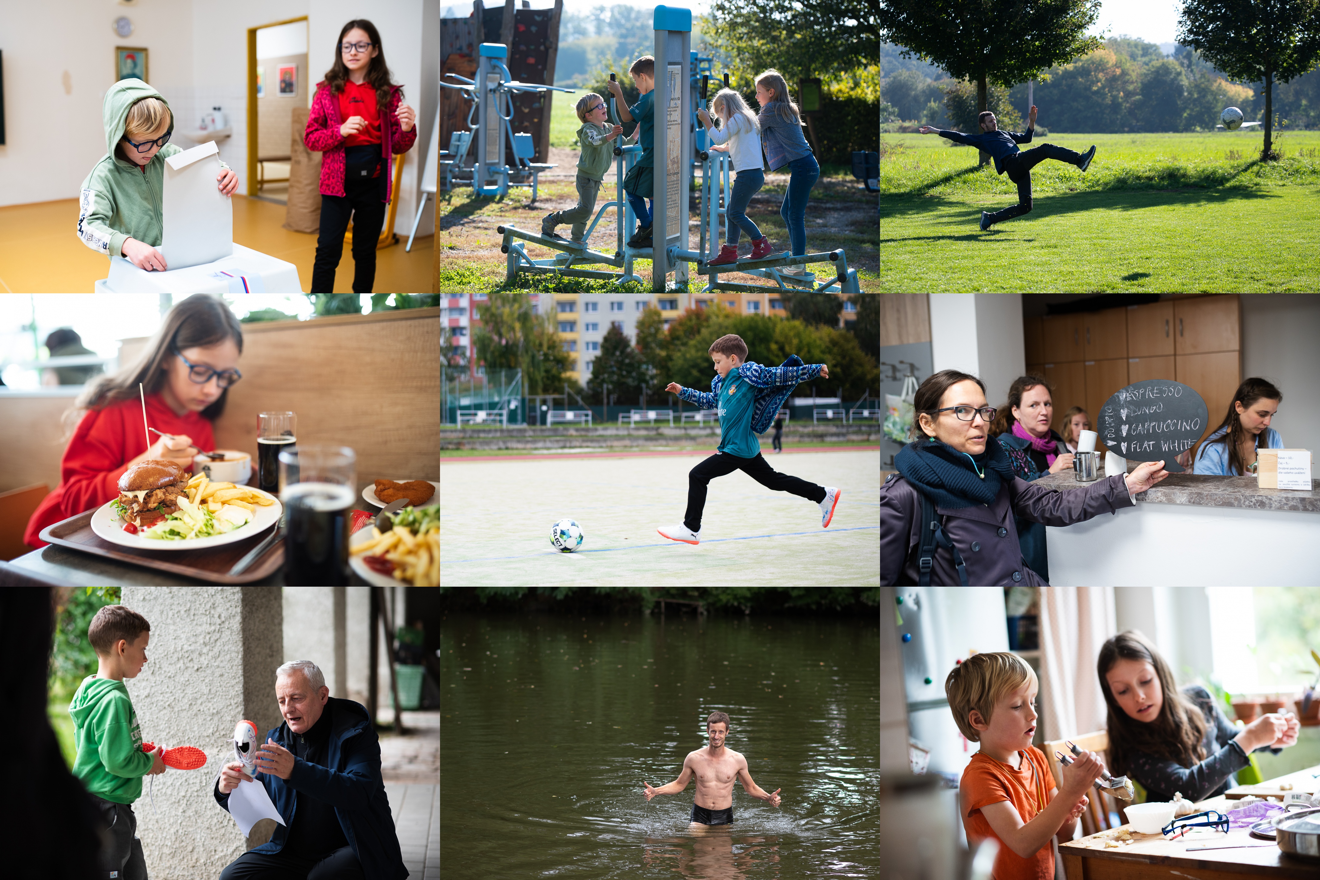 Jedna volební / Synchronizované cvičení v Kníničkách / Tom a jeho vybraný fotbalový styl / Restaurace Globus - impresivní vzhled, ale za tu tlačenici a chaos to (prý) nestálo / Ráďa má nové turfy a nebojí se je použít / Podobnou nabídku naše farní kavárna ještě nezažila / Marcelův (ne)líčený zájem o jeho novou obuv Ráďu potěšil / Je skvělá, jak jinak / Tady vzniká česnečka