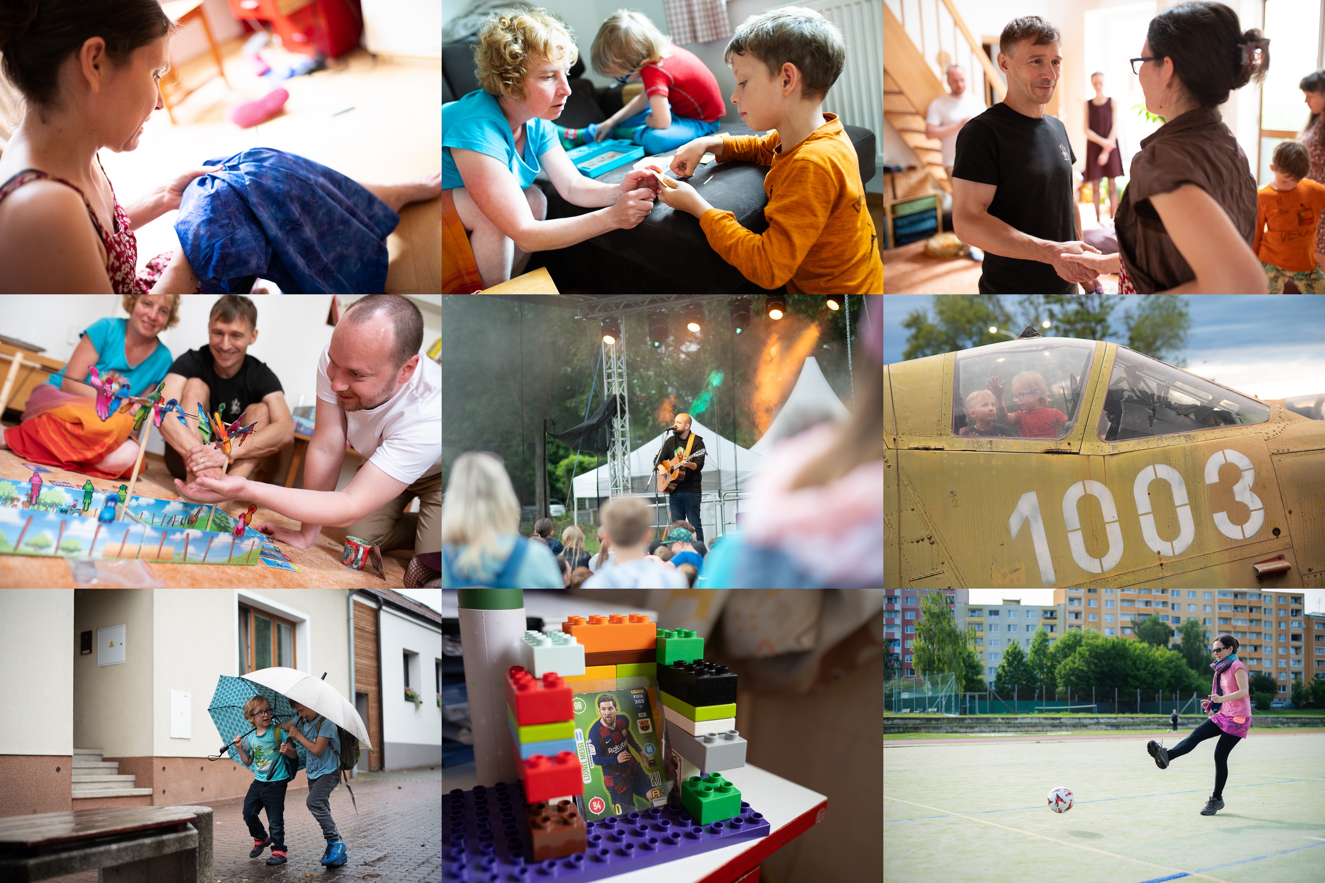 Ještě že z fotky není slyšet, jak jsem u této fináln fáze šití šatů nadávala / Hanka v sobě paní učitelku nezapře, a my jsme rádi, protože děti vypadají spokojeně / Gratulace / A hraní - zde fáze Odlet hejna / Skočili jsme si do Technického muzea mrknout se na Pokáče / A prozkoumat zdejší venkovní exponáty / Přátelství pod deštníky / Lionel Messi si nechal postavit domeček na míru / Můj vytříbený fotbalový styl