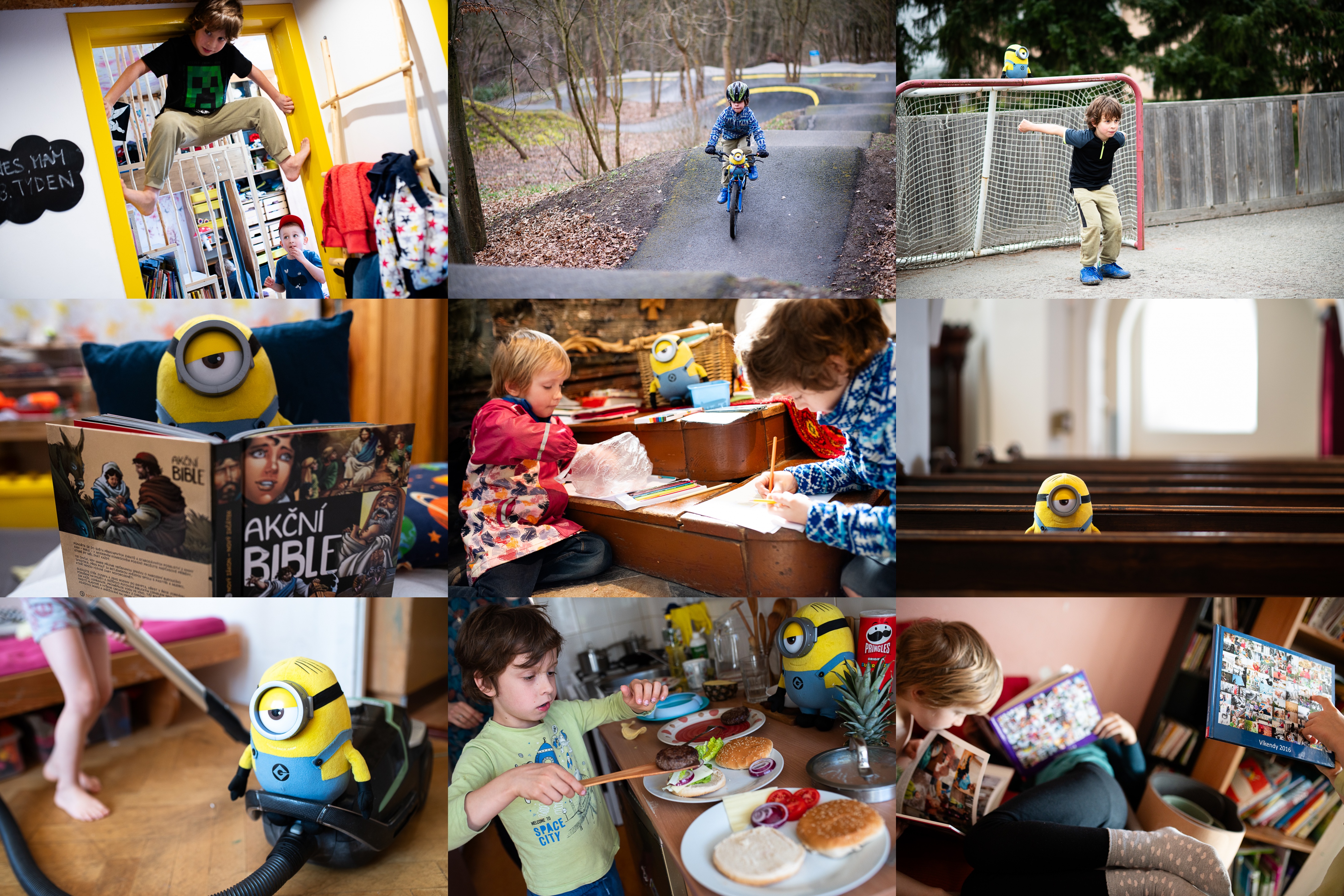 Na návštěvě. Ráďa předvádí šplhání na futra, kdyby prý to náhodou ještě neznali / Viki má na víkend doma mimoně Stua. Provezl ho pump trackem. / Stu mu pomáhal v bráně při fotbale / A četl na dobrou noc / Malířské doupě v boční kapli / I Stu se umí modlit / Budeme mít návstěvu, Stu naštěstí vysaje / Zatímco Ráďa připraví hamburgery / Děti si prolistovaly "své" fotoknihy
